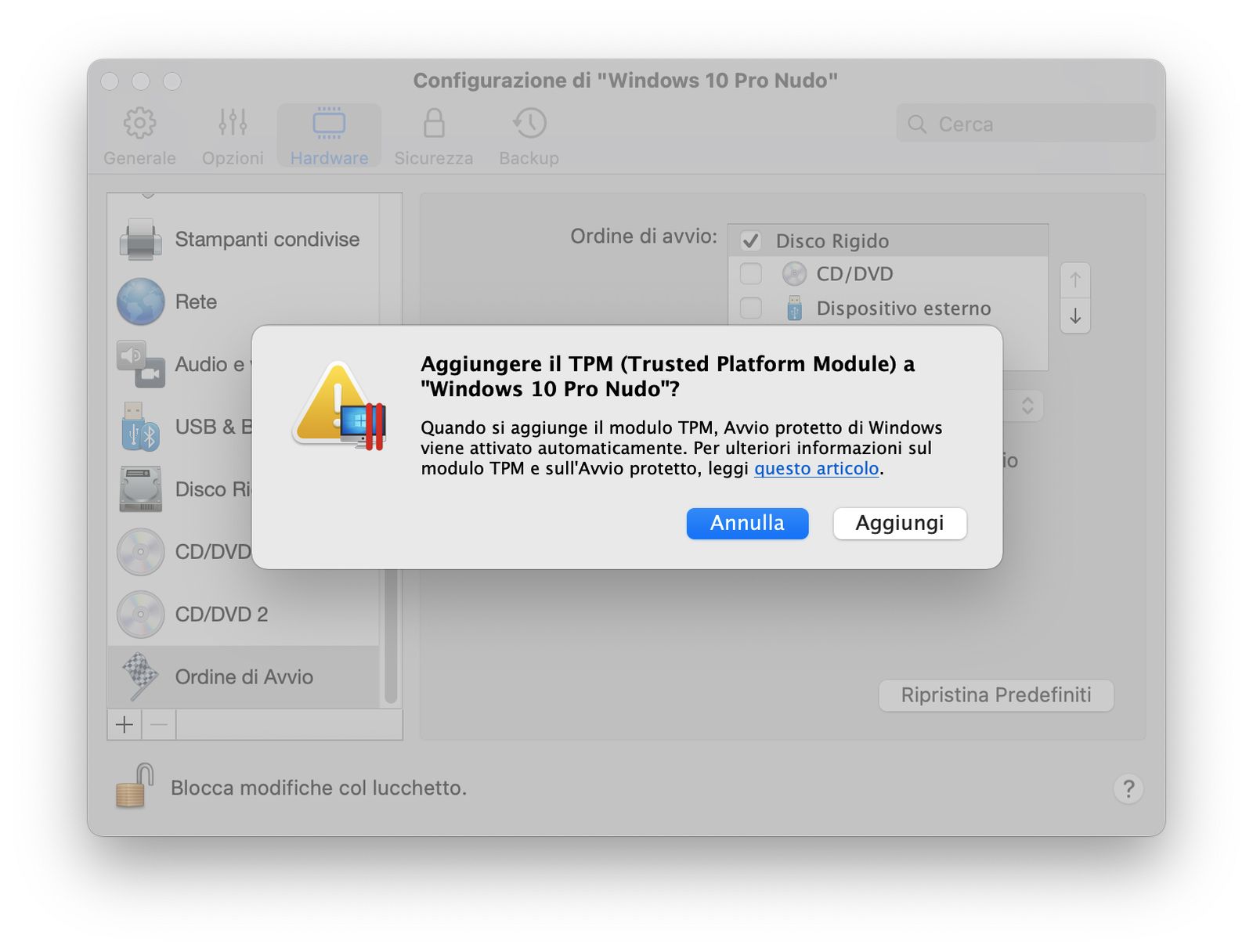 Per le nuove macchine virtuali Windows 10 create sui computer Mac con il chip Apple M1, il chip TPM virtuale viene aggiunto automaticamente. Quando alla configurazione della macchina virtuale viene aggiunto un chip TPM virtuale, Avvio protetto di Windows viene attivato automaticamente.