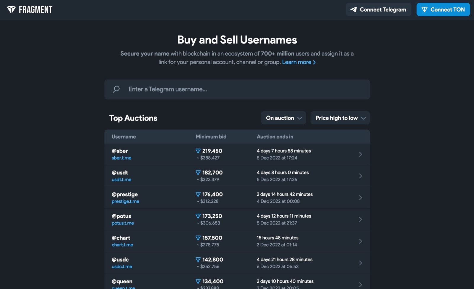 Fragment è già nato per essere una piattaforma d’asta completamente decentralizzata. Le aste finora hanno riguardato i nomi degli utenti: in un mese sono stati venduti i certificati per i nomi utenti pari a 50 milioni di dollari. Il prossimo passo?