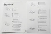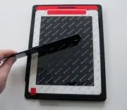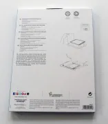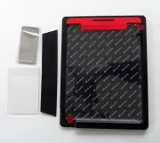 La confezione è in normale cartoncino molto colorato che mostra già da subito il sistema pensato per l’applicazione: si tratta di una “dima” in plastica nera che funziona come una culla per posizionare esattamente l’iPad sotto la pellicola che è attaccata alla parte superiore a mo’ di coperchio.
