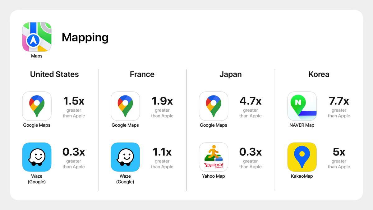 I dati usati per lo studio provengono da Data.Ai (App Annie) e includono metriche come utenti attivi, tempo trascorso nelle app e numero totale di download. Le percentuali si basano sulla popolarità relativa di un’app locale rispetto a un’app Apple in termini di utenti attivi giornalieri o tempo trascorso nell’app. Tutte le immagini e le tabelle sono di Apple.