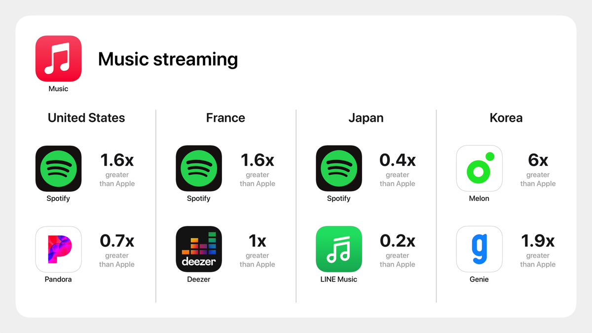 Seguono alcuni dati riguardanti gli Stati Uniti: Spotify ha un utilizzo 1,6 volte superiore rispetto ad Apple Music, Netflix 17 volte superiore a Apple TV+, Wattpad 5,5 volte superiore a quello di Apple Books, Kindle 4,5 volte superiore ai libri di Apple.