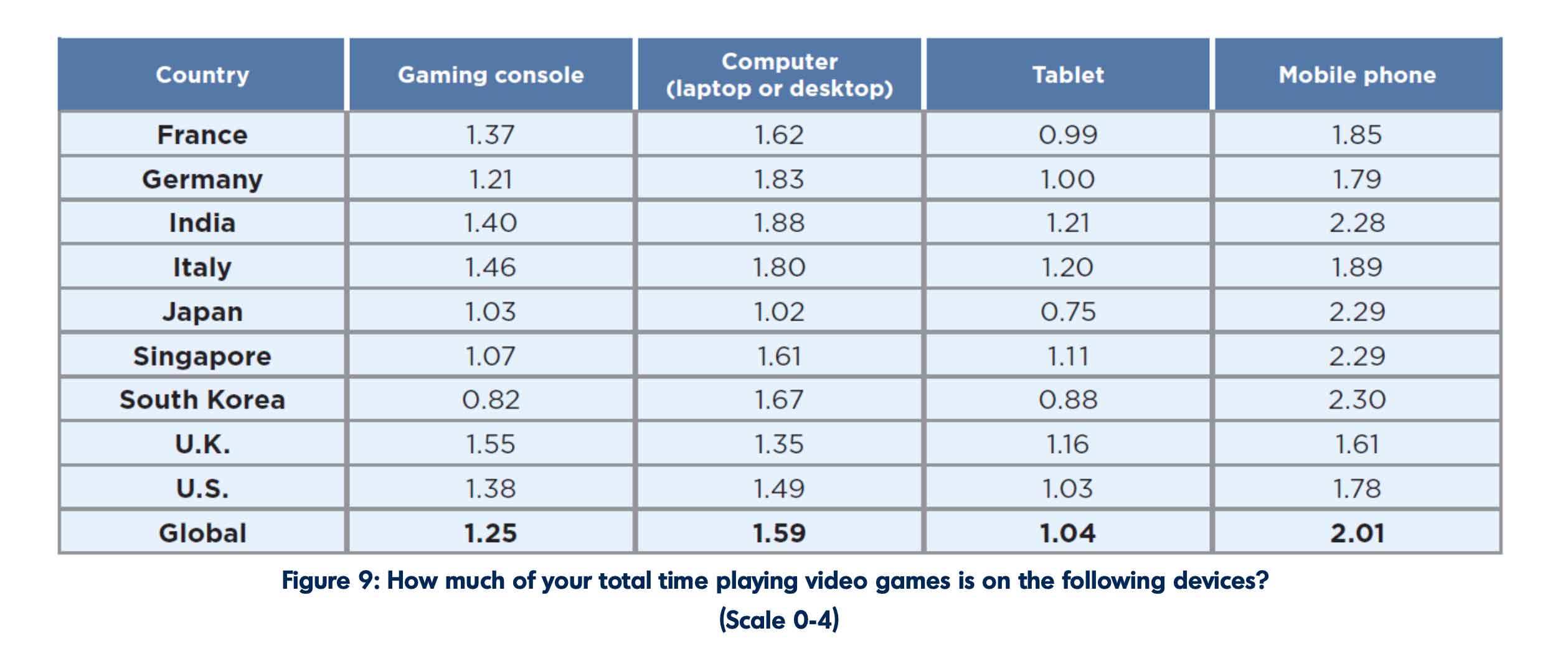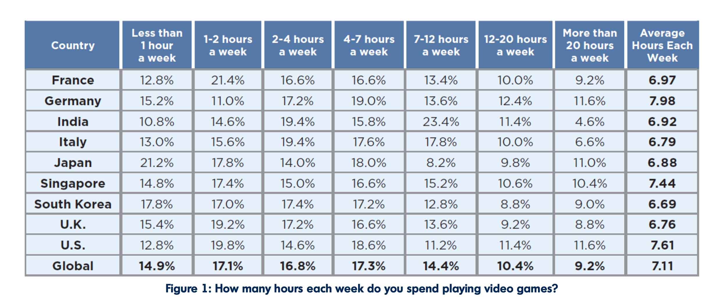 Il rapporto State of online gaming si basa sulle risposte di 4.500 utenti in Francia, Germania, India, Italia, Giappone, Singapore, Corea del Sud, Regno Unito e Stati Uniti di età pari o superiore ai 18 anni che giocano ai videogiochi almeno una volta alla settimana. Il rapporto completo, con numerosi e dettagliati dati, si trova a questo indirizzo.
