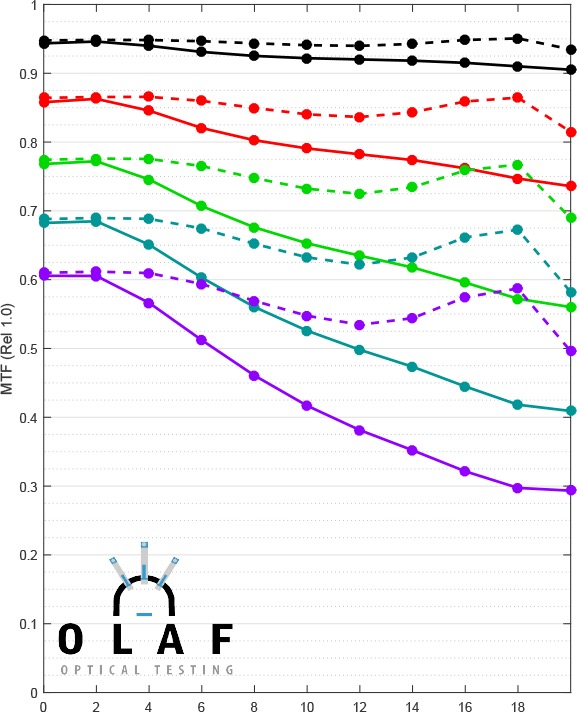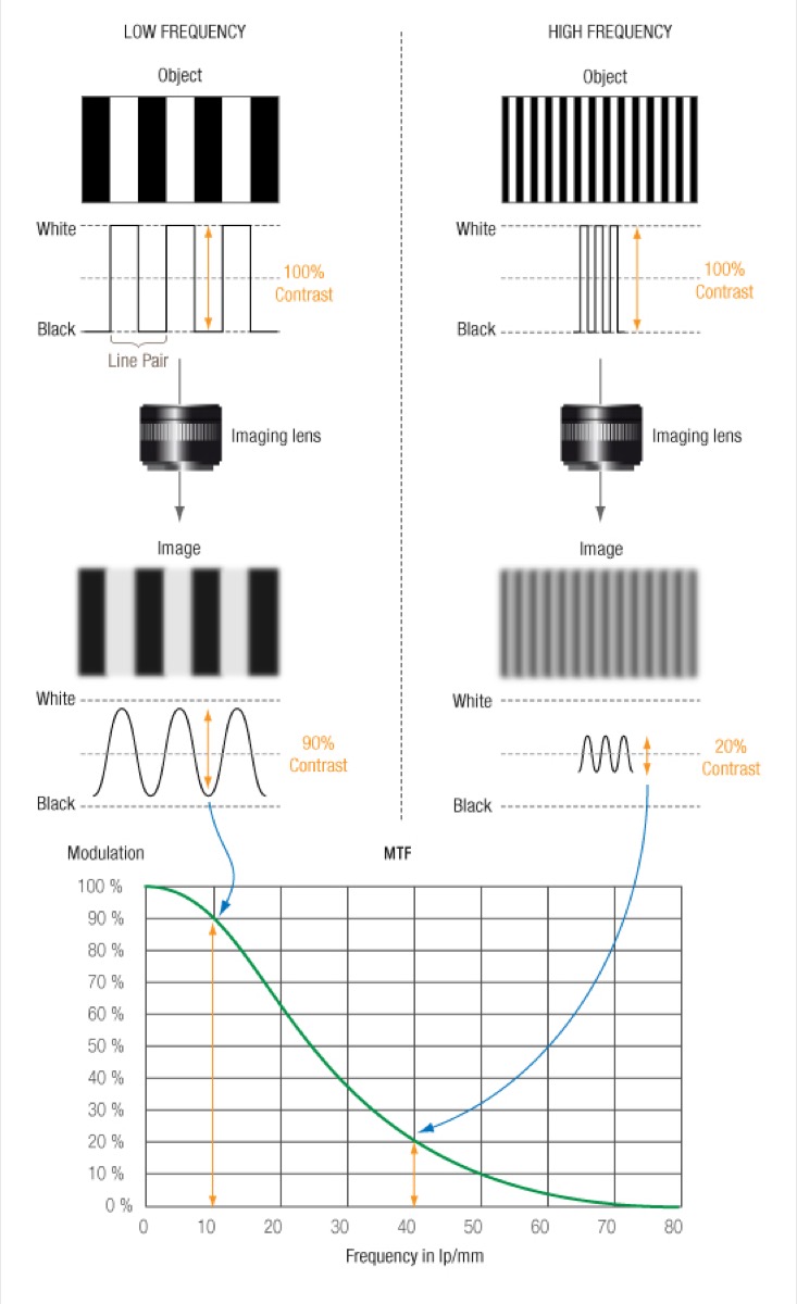 Il grafico si chiama MTF, (Modulation Transfer Function) funzione di trasferimento della modulazione, e permette di valutare i diversi livelli di nitidezza e contrasto forniti dagli obiettivi fotografici. Una lettura obbligatoria durante gli anni Sessanta, Settanta e Ottanta, nel pieno dei fotoamatori di macchine fotografiche reflex, divenuto una rarità negli anni Duemila e oggi praticamente ignorato visto che le macchine fotografiche attuali sono completamente in balia del software e perché i sensori sono apparentemente (ma solo apparentemente) una cosa diversa dalla pellicola.