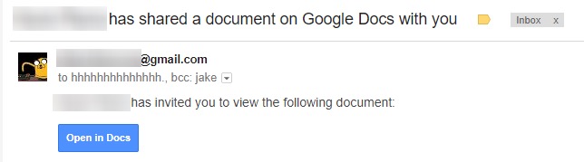 L’attacco inizia con una email in cui qualcuno vi annuncia di aver condiviso un documento di Google Docs con voi, un’email identica a quella che si riceve quando qualcuno condivide davvero un documento Google Docs con un account Gmail.