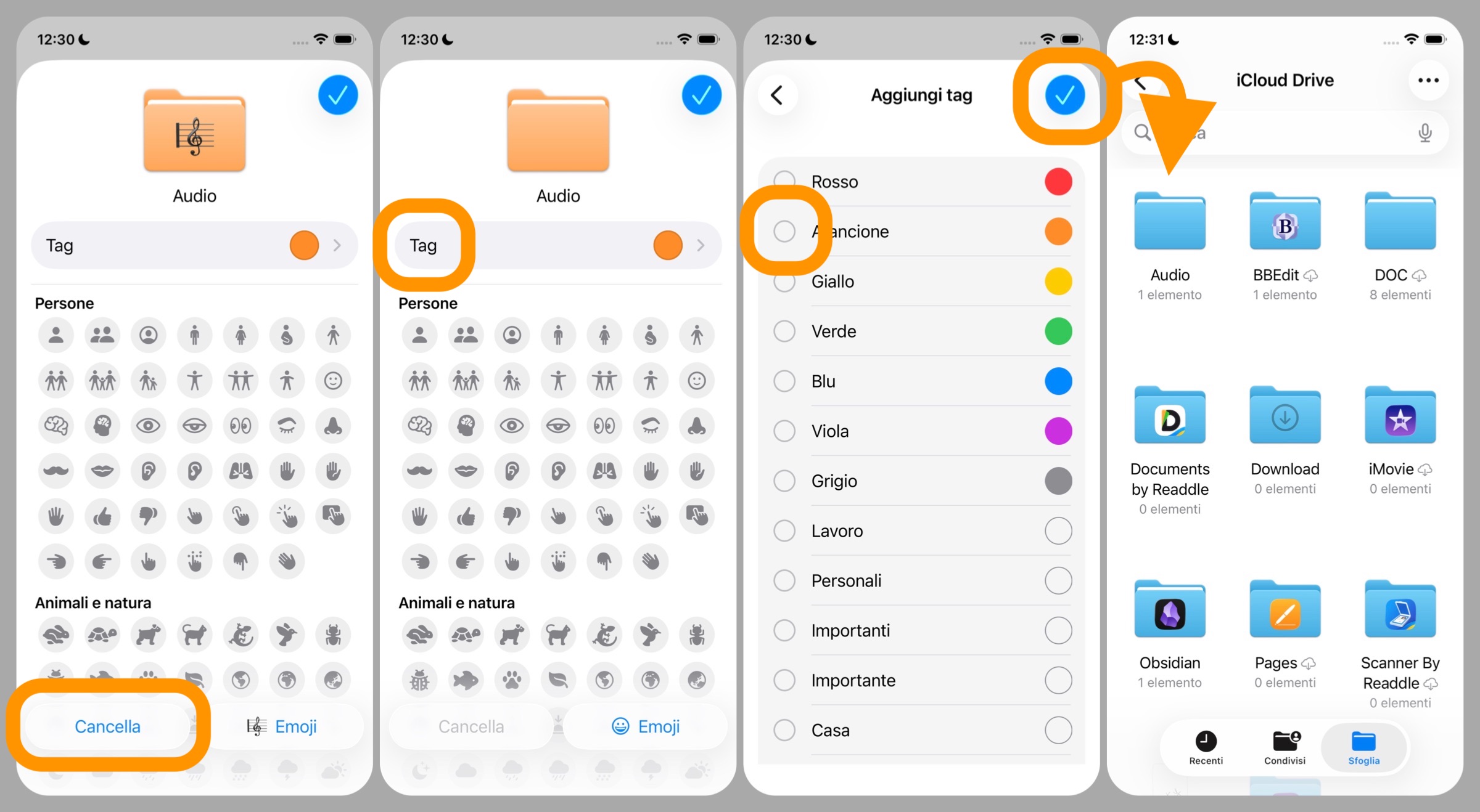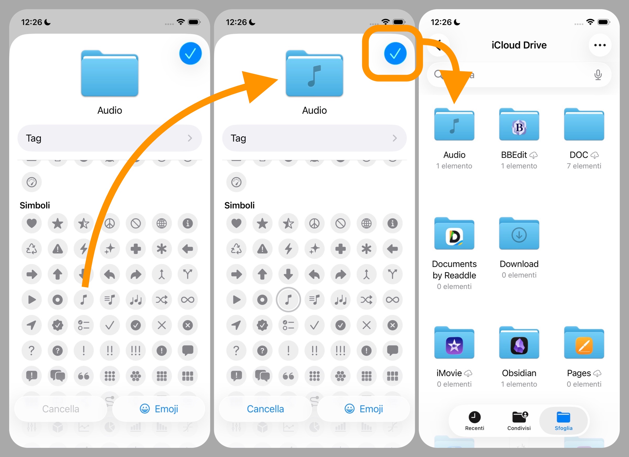 Oltre al colore si può anche applicare un’icona predefinita o un’emoji che riveste la superficie centrale della cartella. Seguite le stesse istruzioni descritte in precedenza fino al punto 4, poi: