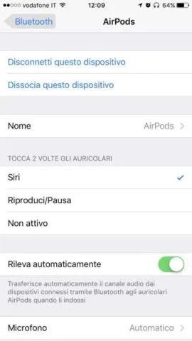 Inoltre, Da questo menù sarà possibile personalizzare il doppio tocco. Di default, toccando due volte gli auricolari, tramite doppio tap, si richiamerà Siri, l’assistente virtuale di Cupertino. In alcuni casi, però, come quando si è in assenza di connessione internet, tale funzione può risultare inutile. Ed allora, da questo menù sarà possibile scegliere la voce “Riproduci/Pausa“, che tramite doppio tocco avvierà, o fermerà, la musica in riproduzione. E’ anche possibile scegliere di non attivare tale funzione; in quest’ultimo caso gli auricolari non risponderanno al doppio tocco.