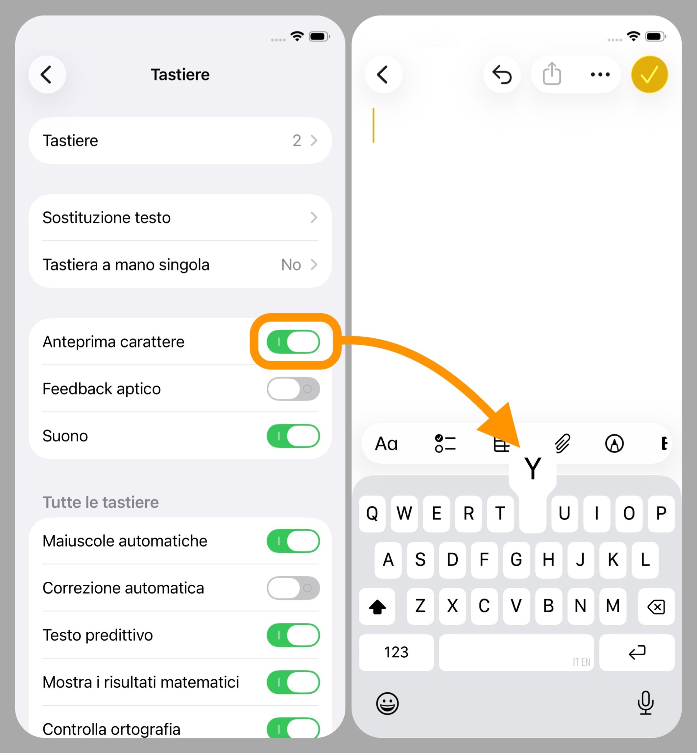 La prima cosa che potete fare è abilitare l’anteprima dei caratteri per aggiungere un feedback visivo durante la digitazione. In questo modo ogni pulsante premuto verrà rapidamente mostrato anche in grande subito sopra il dito permettendovi di accorgervi più facilmente quando ne avete pigiato uno sbagliato.