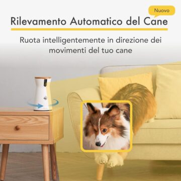 Aggiungiamo come extra questa particolare telecamera per cani, perché è a metà tra un sistema di controllo a distanza e un gioco con premio per intrattenerlo. Da un lato infatti consente di dare un’occhiata a quello che succede in casa sfruttando la videocamera Full HD con angolo di campo di 160 gradi (con zoom 4x all’occorrenza) e visione notturna: in più grazie a microfono e altoparlante integrati permette l’audio bidirezionale e quindi di comunicare a distanza con il proprio cane. In tal senso è anche in grado di riconoscere quando il cane abbaia, segnalandolo immediatamente al proprietario tramite una notifica sullo smartphone.