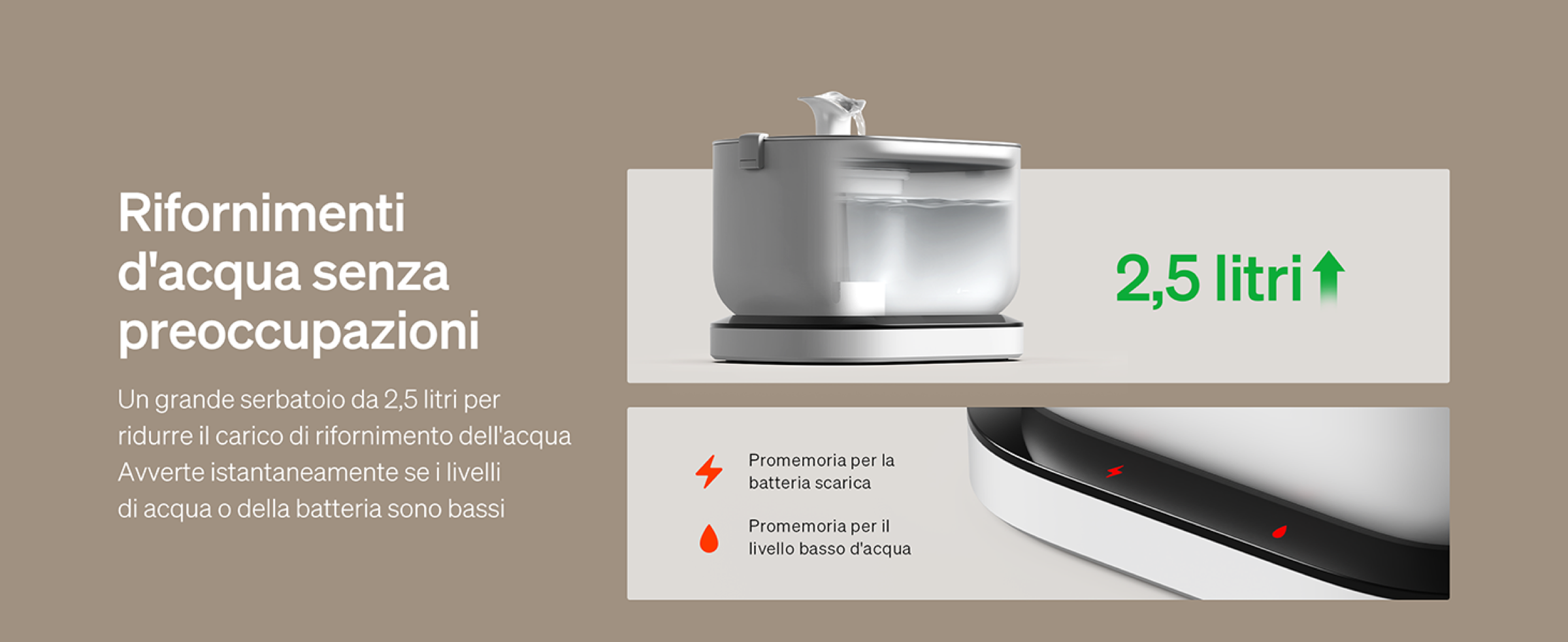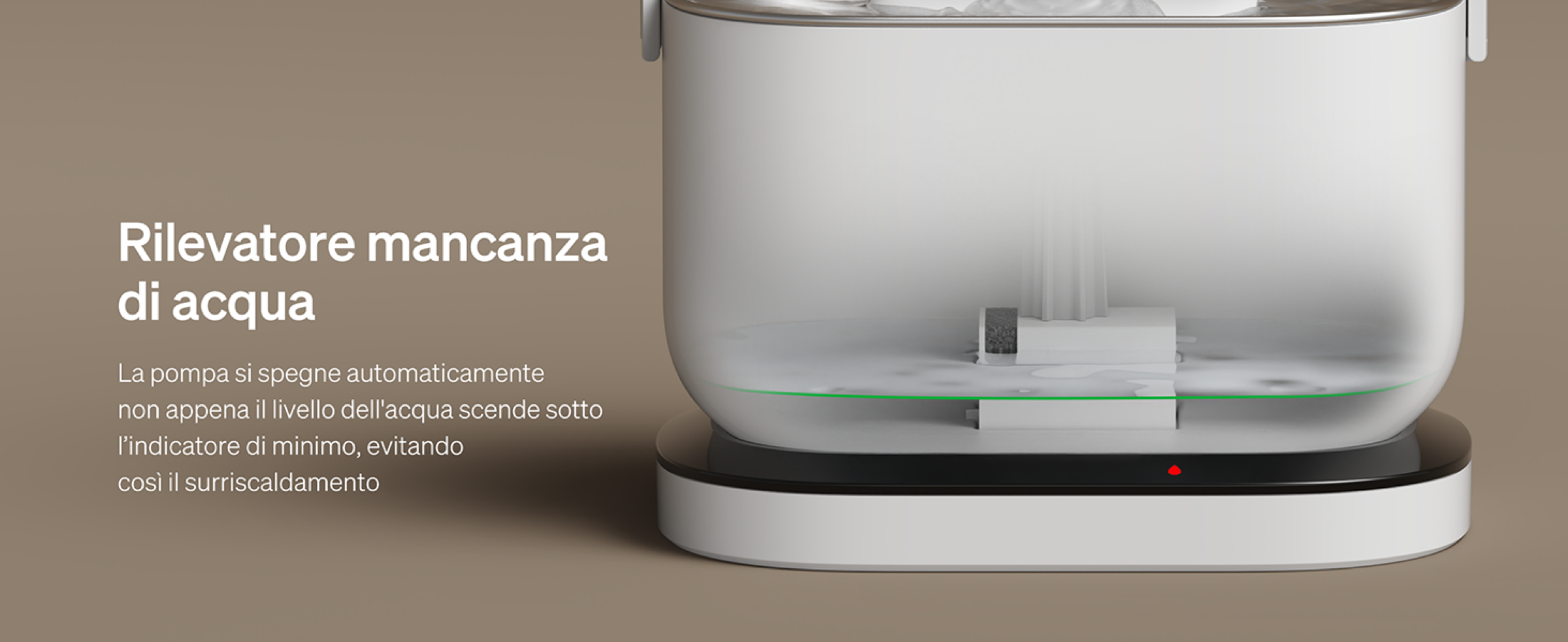 Facciamo inoltre presente che anche la pompa e la base di ricarica sono completamente senza fili, il che rende la fontanella particolarmente sicura perché non ci sono cavi esposti né si corre il rischio di scosse elettriche.