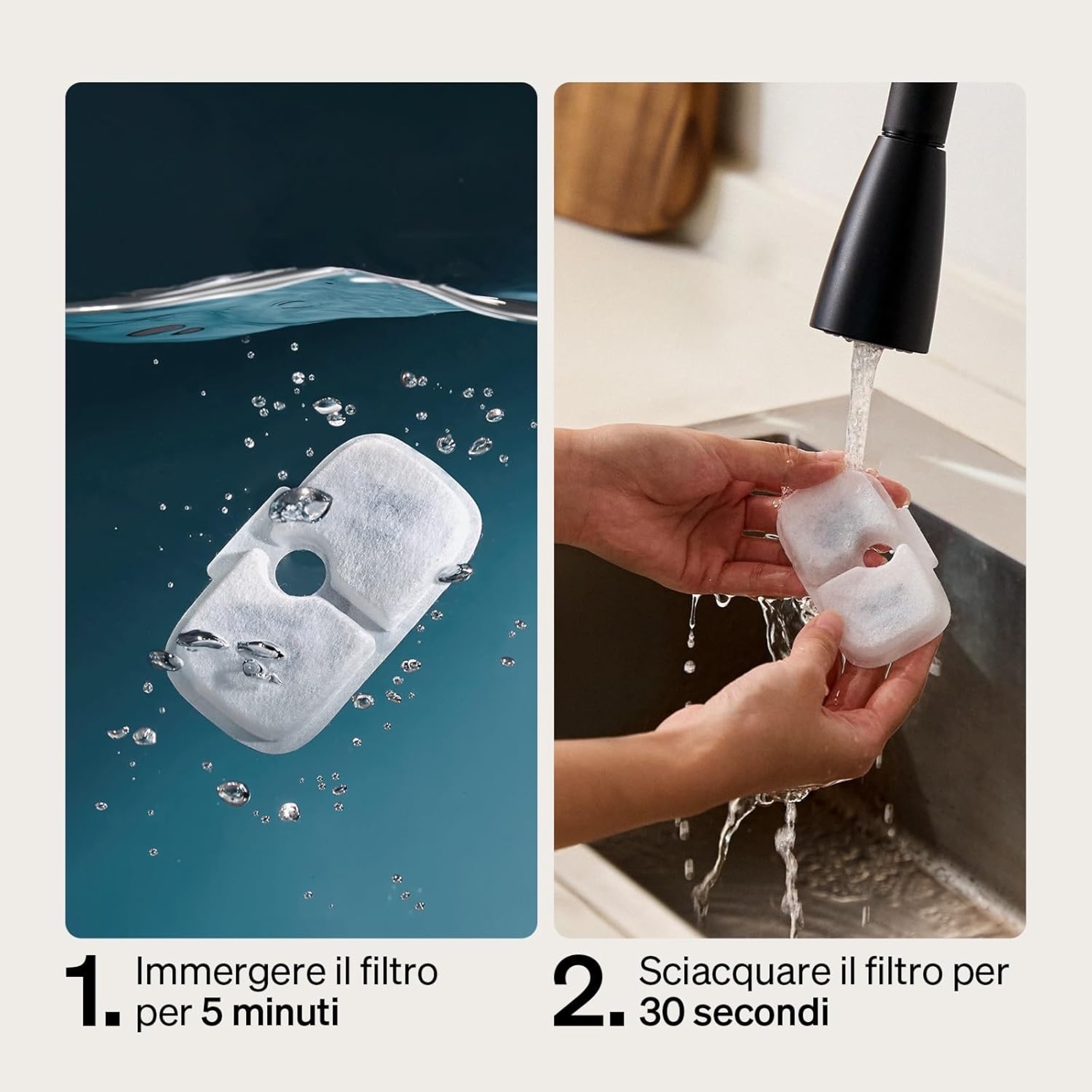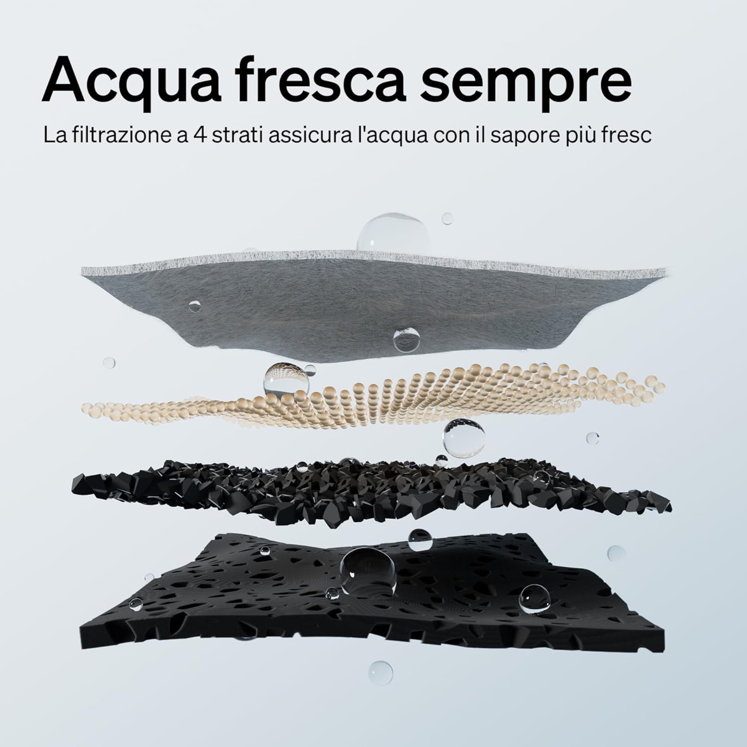 La qualità dell’acqua invece è garantita da un sistema di filtraggio a più strati: il carbone attivo elimina gli odori, la resina scambiatrice di ioni ammorbidisce l’acqua e riduce i metalli pesanti, un filtro in tessuto trattiene peli e impurità, mentre una spugna aggiuntiva protegge la pompa da detriti e intasamenti.