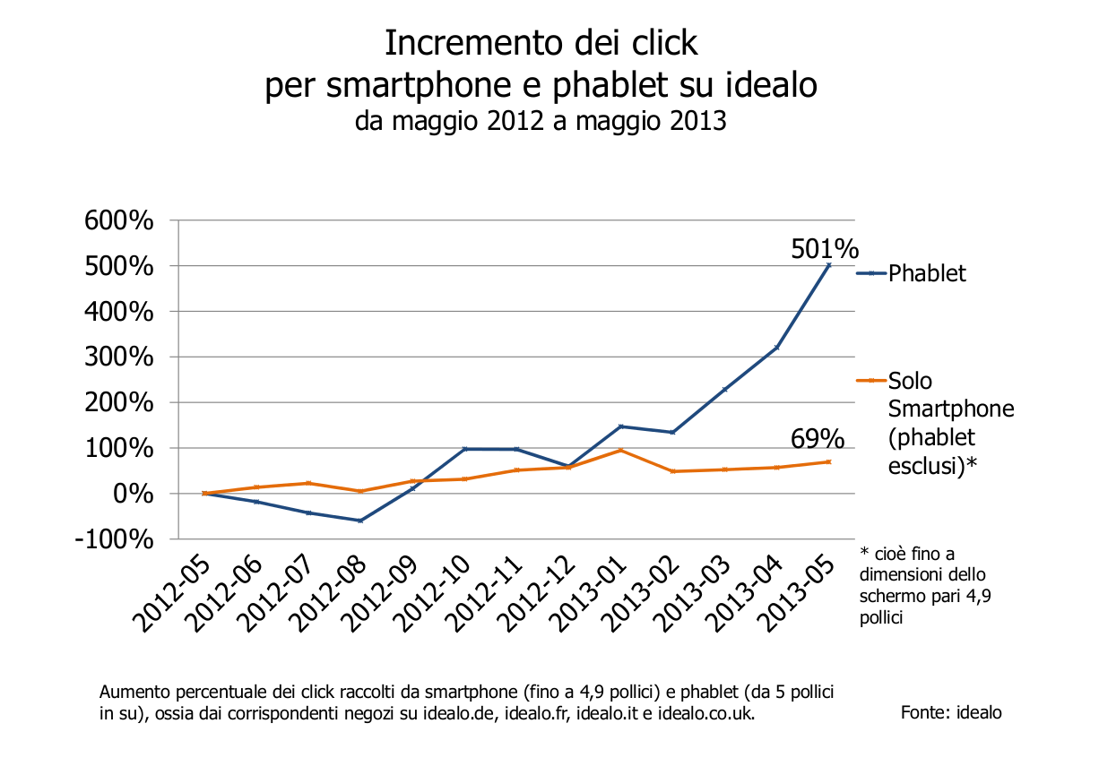 Il fenomeno dei phablet non è un fuoco di paglia: secondo i dati ricavati da Idealo, azienda che gestisce diversi portali dedicati alla comparazione prezzi, il 2013 sta mostrando un significativo incremento di interesse da parte dei consumatori per i dispositivi con schermo generoso, più precisamente con diagonale compresa fra i 5 e i 7 pollici. Una tendenza trainata anche dalla sempre crescente dimensione dei dispositivi sul mercato, passata dal 3.6o del 2011 al 4.20 del 2013.