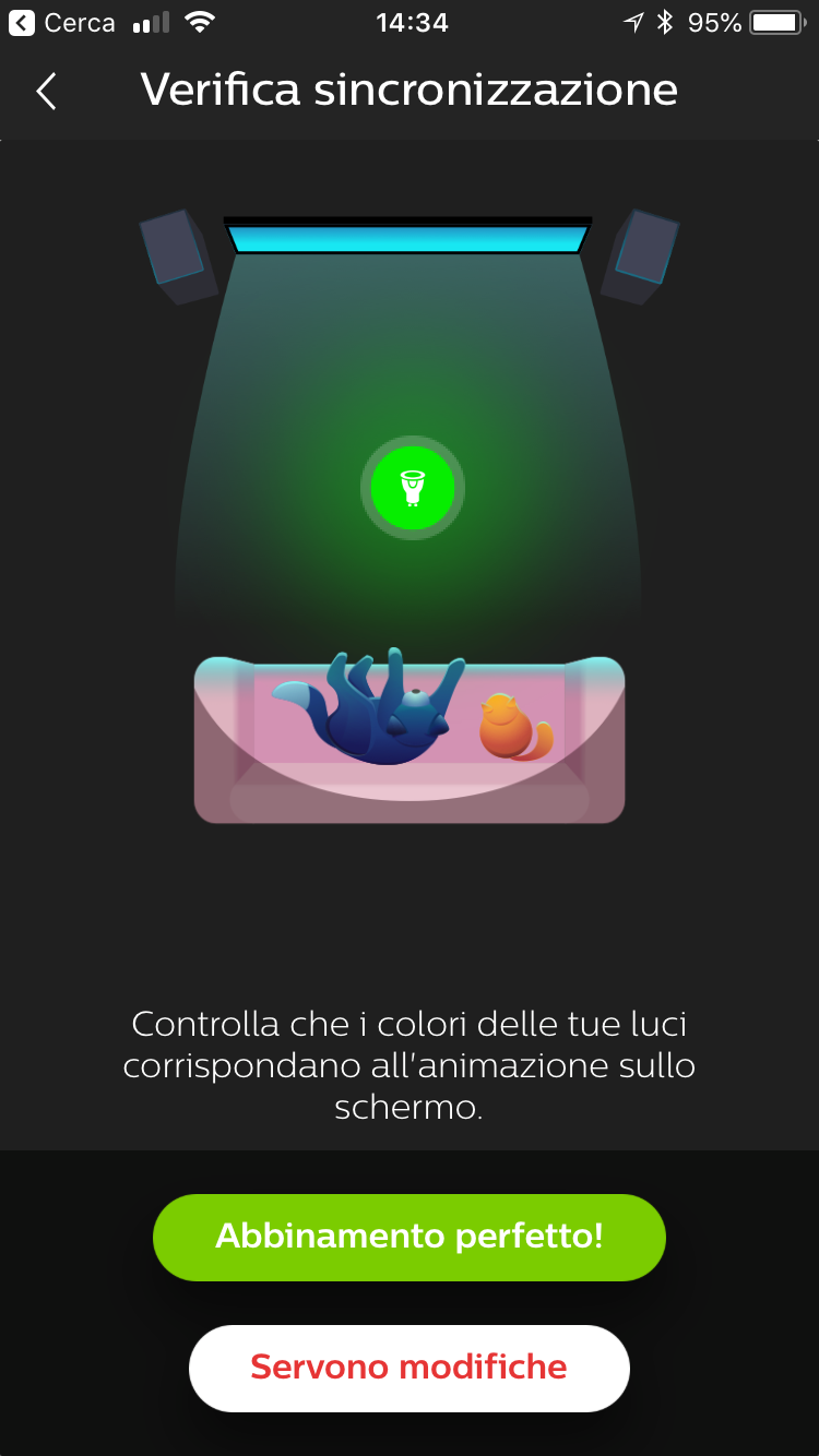 Per partire è necessario disporre sulla schermata apposita dell’ultima versione della App Hue per Android o iOS gli elementi illuminanti sulla scena che prevede uno schermo, degli speaker e un divano che rappresenta la postazione dello spettatore: Signify la chiama Area di Intrattenimento.