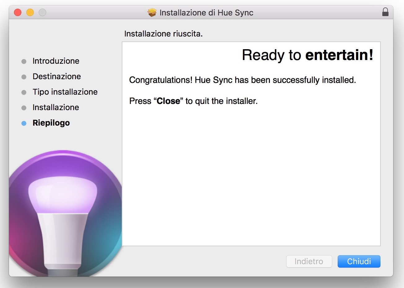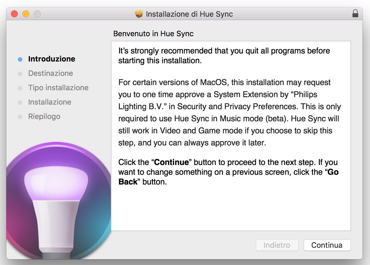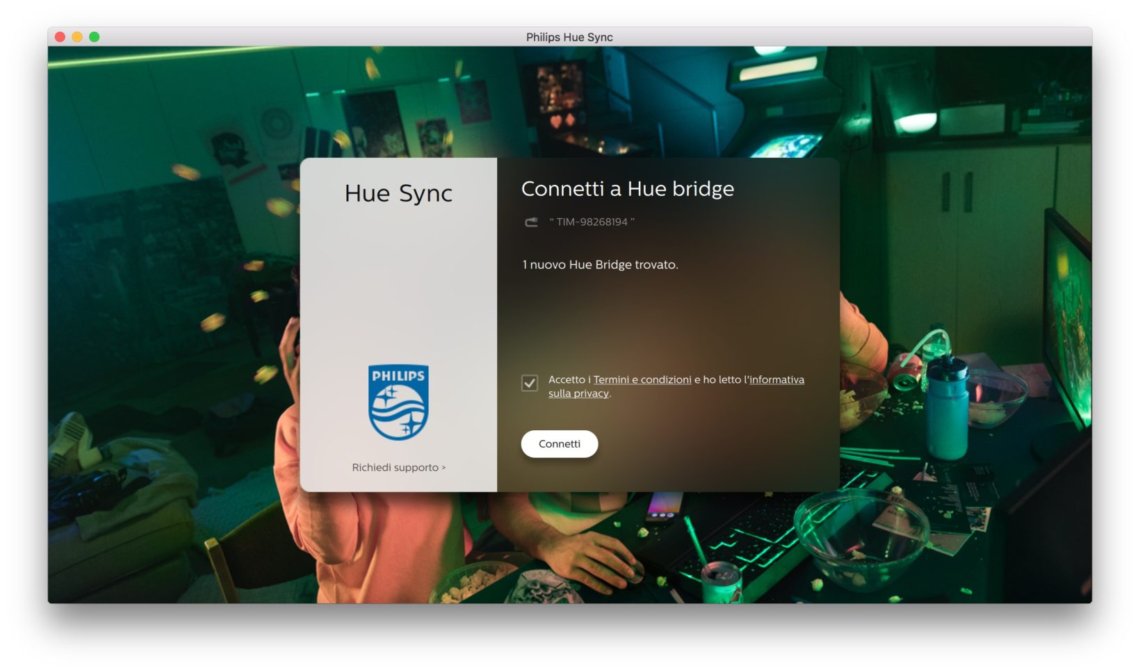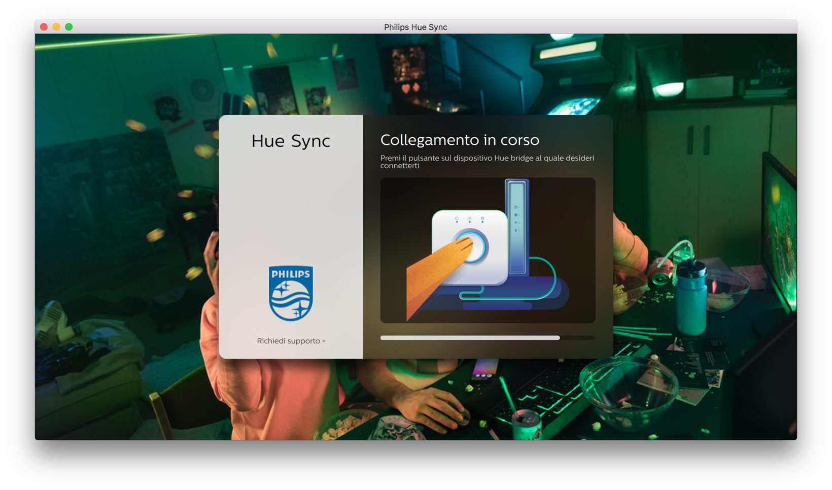Una volta installato il software dovremo lanciare la classica procedura di accoppiamento con il sistema HUE che prevede la pressione sul grande tasto superiore del gateway: ora il nostro Mac o PC sarà indissolubilmente legato all’HUB di Philips / Signify.