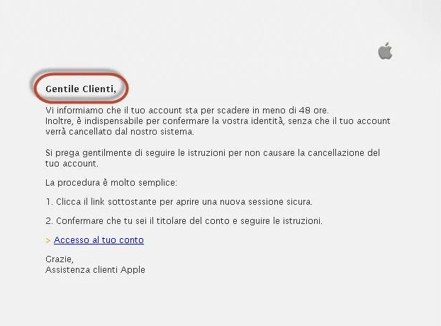 La mail che molti lettori hanno ricevuto presenta ovviamente tutti gli indizi per essere riconosciuta come falsa. Anzitutto, è scritta in un italiano molto pasticciato e si rivolge agli utenti con un generale “gentili clienti”, senza identificare i veri dati anagrafici del destinatario. L’unico reale elemento di pericolo, che potrebbe trarre in inganno un utente sovrappensiero, o semplicemente distratto, è la mail del mittente, ossia [email protected]. Sebbene i nomi richiamati possano essere ricollegati al marchio Apple, si tratta senza ombra di dubbio di una comunicazione falsa, che dovrà essere immediatamente cestinata.