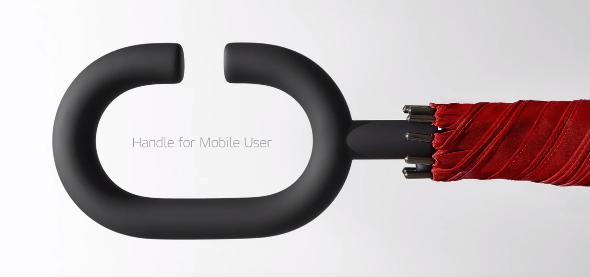 L’operatore coreano KT si è inventato questo particolare ombrello, il Phone-brella. Nessuna funzionalità super-tecnologica, nessuna sensore o particolarità hi-tech: il Phone-brella si distingue da un ombrello tradizionale semplicemente per l’impugnatura, che permette di far scivolare l’avambraccio all’interno della stessa per sorreggere il peso dell’ombrello appoggiandolo sia all’avambraccio stesso che alla spalla.