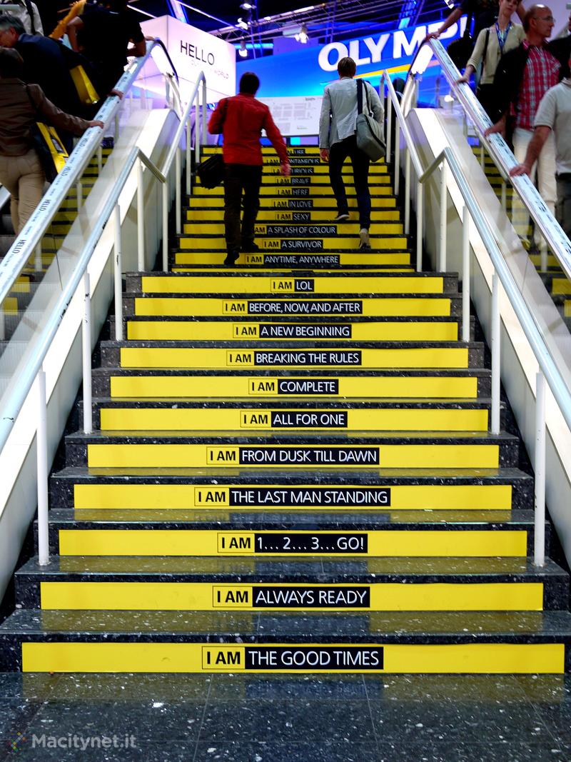 L’originale scala: ogni gradino propone varianti sullo slogan I Am Nikon