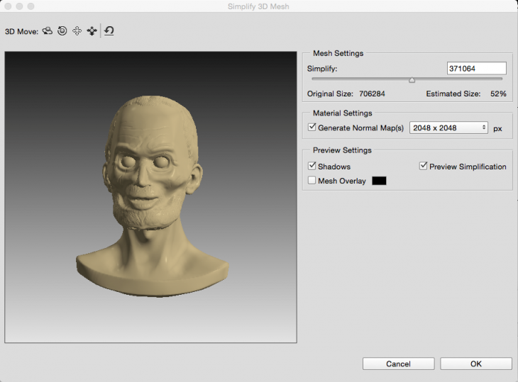 La prima è denominata “3D Mesh Simplification” è permette di modificare in modo semplice (tramite uno slider) il numero dei poligoni nei modelli velocizzando l’elaborazione e permettendo di sfruttare gli oggetti 3D su vari dispositivi. Sfruttando questa funzione, in pratica si ottengono performance migliori, si possono sfruttare funzioni di stampa e opzioni di condivisione. L’opzione è utile con le stampanti 3D a basso costo o per l’output verso dispositivi che non gestiscono un numero elevato di poligoni o che, ad ogni modo, non ha senso gestire in questo modo.