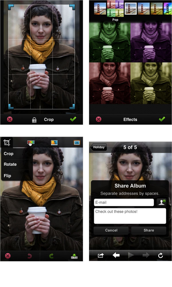 Direttamente dallo schermo di iPhone e touch è possibile utilizzare gli strumenti fondamentali del fotoritocco come taglia, ruota e capovolgi, intervenire su esposizione e saturazione, applicare filtri ed effetti già  pronti per l’uso. Macitynet ha già  trattato le funzioni di Photoshop.com Mobile in questo articolo precedente.