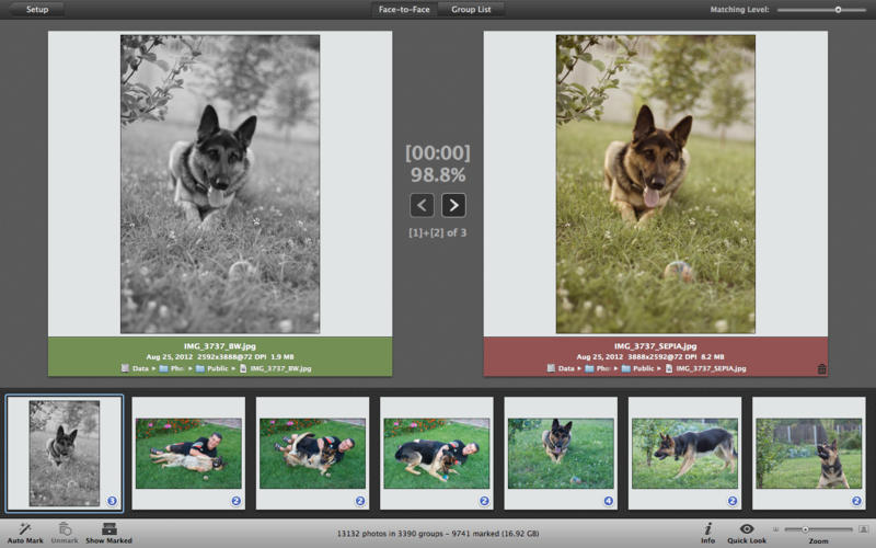 Quest’ultima consente di dare uno sguardo più rapido e veloce e permette di verificare approssimativamente la somiglianza tra due foto. I piccoli riquadri in cui vengono presentate le foto simili permettono, grosso modo, di capire se le due immagini risultano somiglianti o meno, potendo decidere di selezionare quali eventualmente eliminare. La soluzione face-to-face, invece, permette di vedere in modo approfondito e preciso qual è l’esatto grado di somiglianza tra le due immagini. Come in una sorta di trova le differenze della settimana enigmistica, in face-to-face le due foto vengono posizionate l’una accanto all’altra, e PhotoSweeper sarà in grado di esprimere in punti percentuali il grado di similitudine delle immagini. Non solo, ma l’applicazione restituirà qualche dato sulle foto, come il nome, la posizione all’interno dell’hard disk e il peso. In questo modo, sarà possibile eliminare le foto simili ad altre, scegliendo di mantenere sul proprio Mac lo scatto ritenuto migliore, meno pesante o posizionato all’interno di un dato percorso.