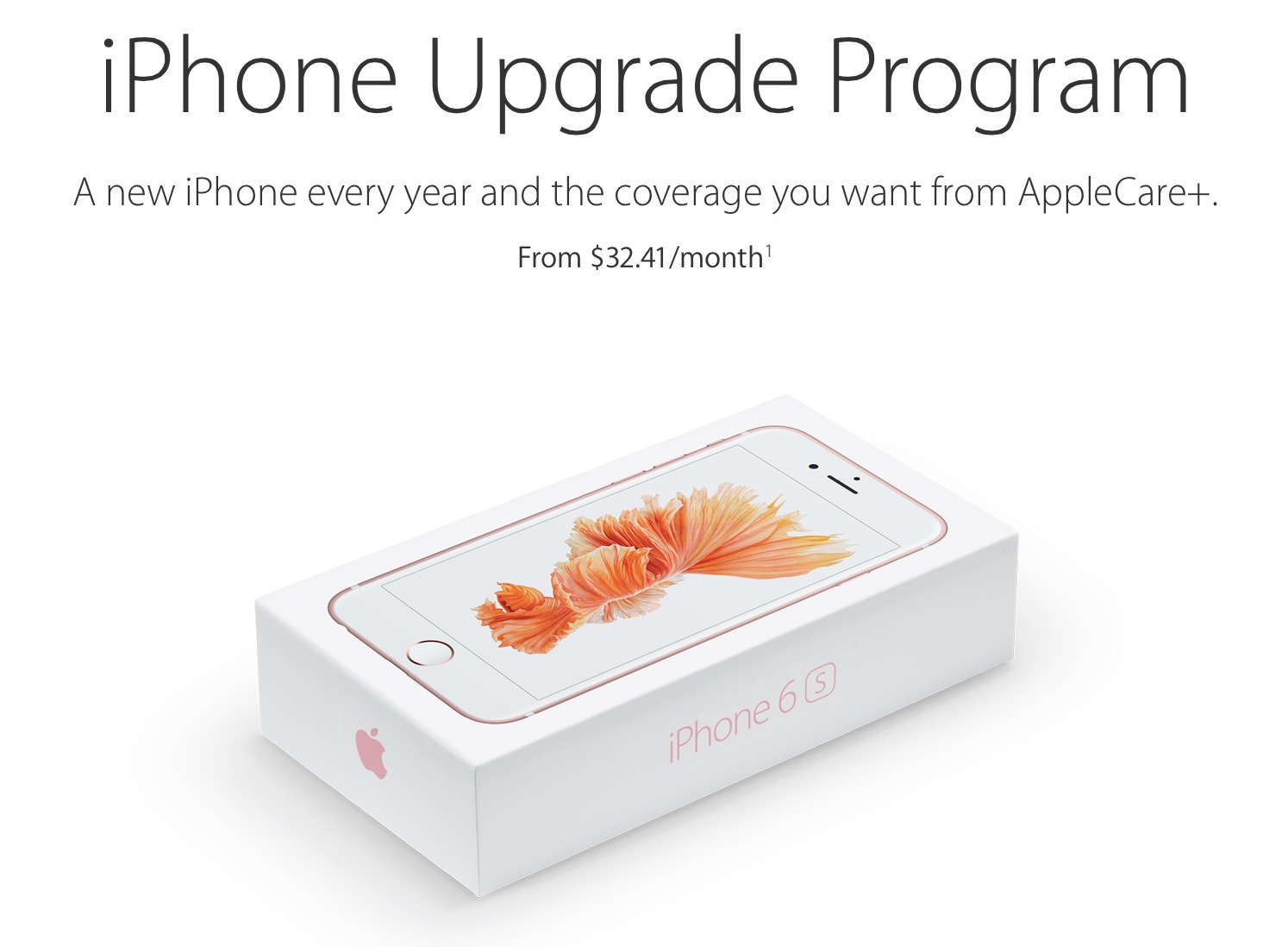 Ricordiamo che con l’abbonamento iPhone Upgrade Program di Apple si pagano 32 dollari al mese per due anni avere iPhone 6s insieme alla estensione di garanzia AppleCare+, con la possibilità di cambiare il terminale con il nuovo iPhone ogni anno. La proposta di Apple risulta leggermente più costosa delle offerte simili di alcuni operatori in USA ma offre il vantaggio della garanzia inclusa. Per Cupertino man mano che più utenti la adotteranno, si avrà un tasso più elevato di rinnovi ogni 12 mesi invece che ogni 2 anni come spesso gli utenti fanno, inoltre i terminali ritirati possono essere ricondizionati e riproposti in vendita.