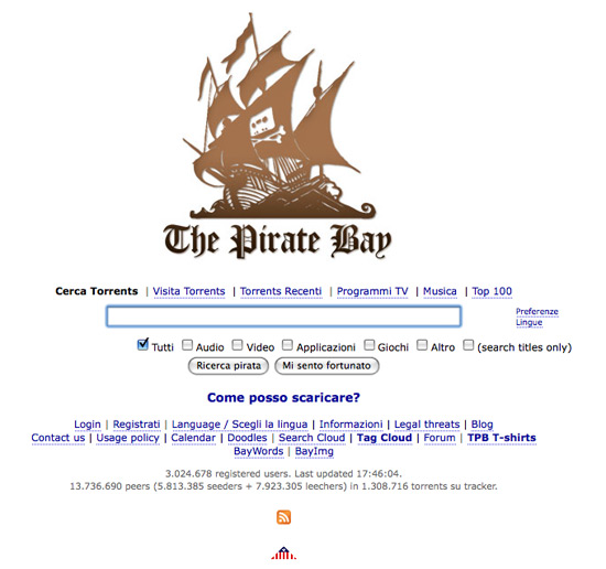La notizia apparsa sul sito Web Lidis.it. La comunicazione inviata dagli ufficiali di polizia ai provider italiani contiene di fatto un ordine con esecuzioni immediata, non un semplice invito facoltativo, per lo sblocco di tutti i collegamenti e di tutti gli indirizzi IP precedentemente bloccati. Nel momento in cui scriviamo il sito The Pirate Bay risulta già raggiungibile: qui sotto la storica home page con l’immagine del galeone.