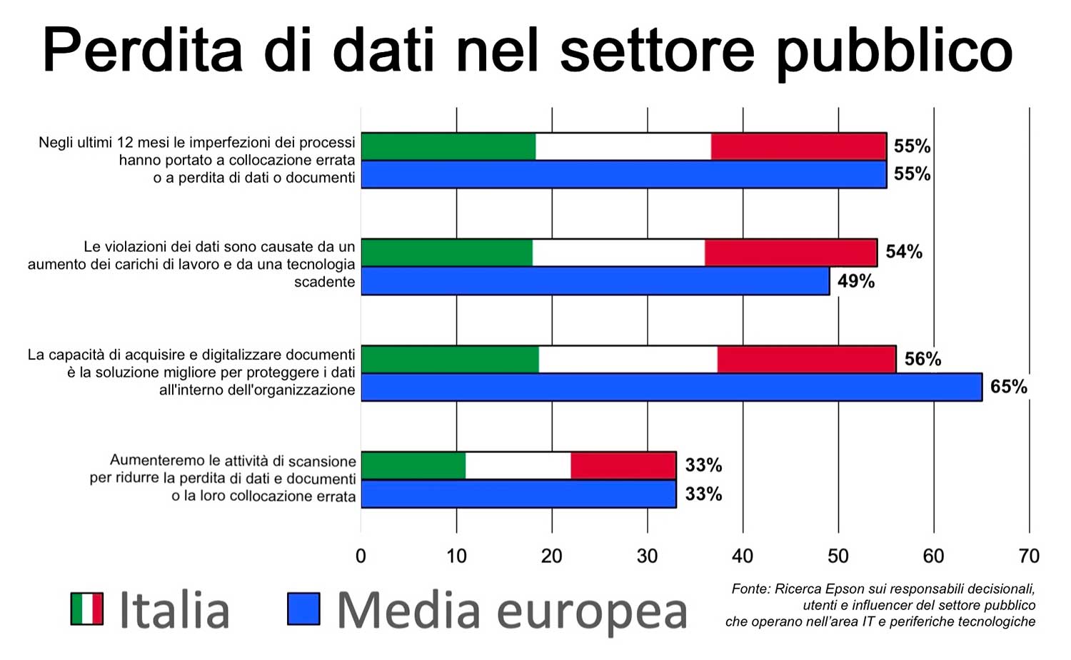 Secondo una recente ricerca di Epson, oltre la metà degli operatori del settore pubblico in Italia (il 55%, la stessa percentuale registrata nei Paesi EU5) ammette che negli ultimi 12 mesi imperfezioni nei processi di acquisizione e conservazione dei dati hanno portato alla collocazione errata o alla perdita di informazioni o di documenti. Oltre un’altra metà (il 54% contro il 49% dei Paesi EU5) afferma invece che le violazioni dei dati sono causate da un aumento dei carichi di lavoro e da una tecnologia scadente.