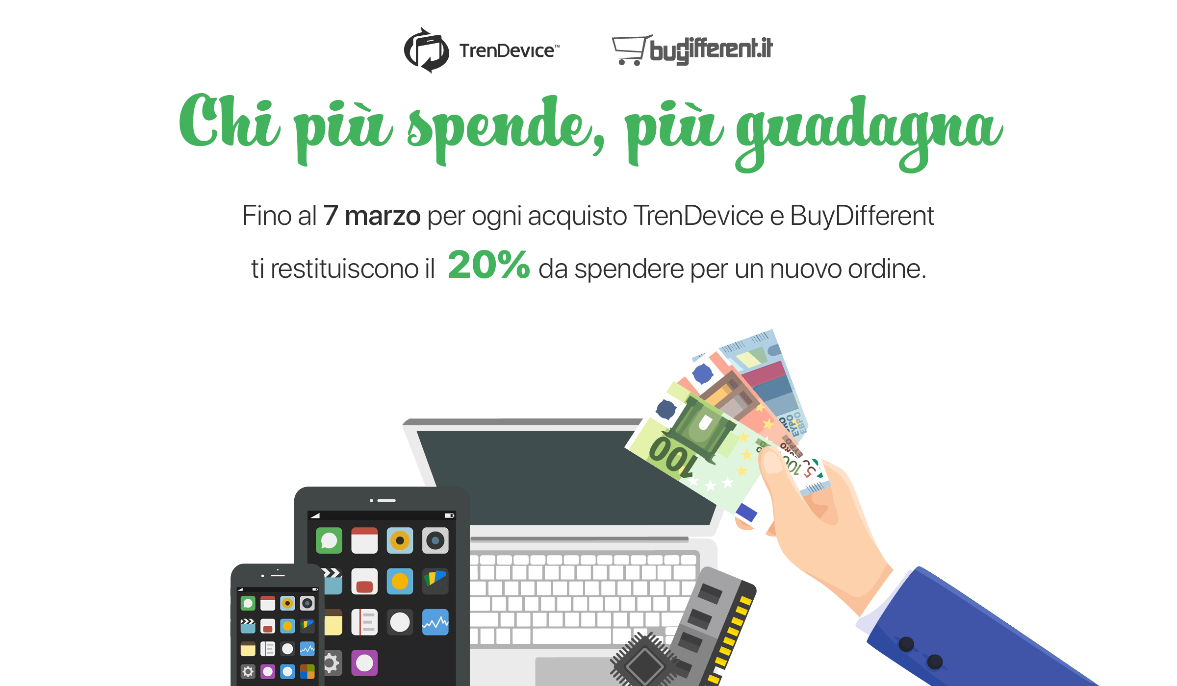 Su TrenDevice e BuyDifferent, fino al 7 Marzo, vi aspetta una straordinaria promozione: per ogni acquisto effettuato vi verrà restituito il 20% della spesa, sotto forma di coupon da utilizzare per un altro ordine o da regalare ad un vostro amico.