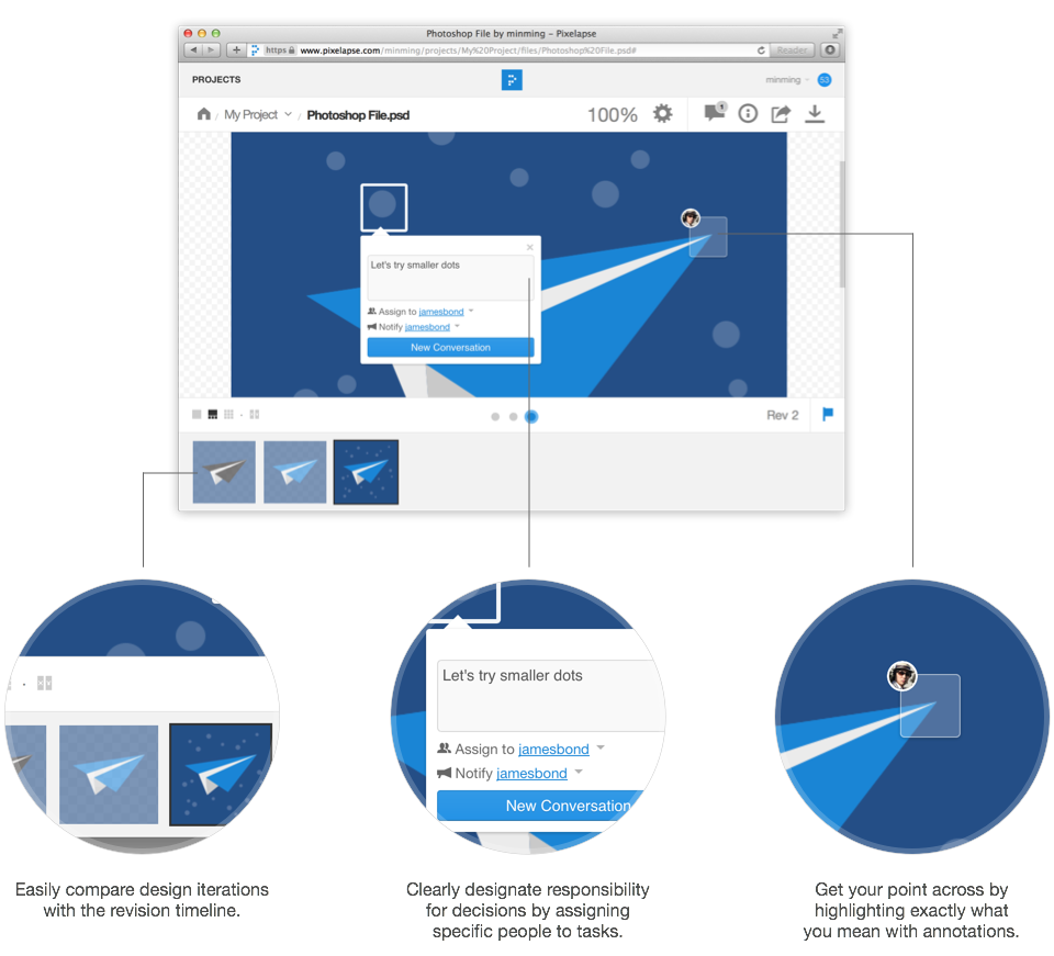Pixelapse è uno strumento utile ai gruppi di lavoro che consente a più persone di lavorare su file Photoshop, Illustrator, InDesign, Fireworks, Graffle e Sketch, ma anche documenti web (HTML, CSS, JS, MD e altri file di testo).