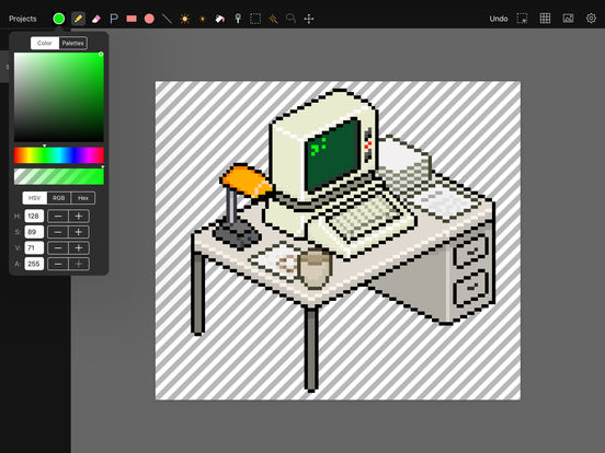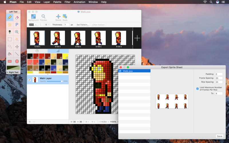 Pixen è un’applicazione di grafica professionale pensata in particolar modo per gli amanti della “raster art”, la grafica bitmapped con i grandi pixel non nascosti ma anzi evidenziati, come ad esempio quelli che vedono nei videogiochi vecchia scuola, con animazioni e sprite con profondità colore a 8 bit. (l’immagine è costituita da una matrice di pixel di R righe e C colonne e ogni colore è codificato con un numero compreso fra 0 e 255). L’applicazione mostra una palette ad hoc con pattern, layer e metta a disposizione uno strumento per ingrandire e lavorare sui dettagli e vari tool che saranno apprezzati dagli amanti di questo genere.