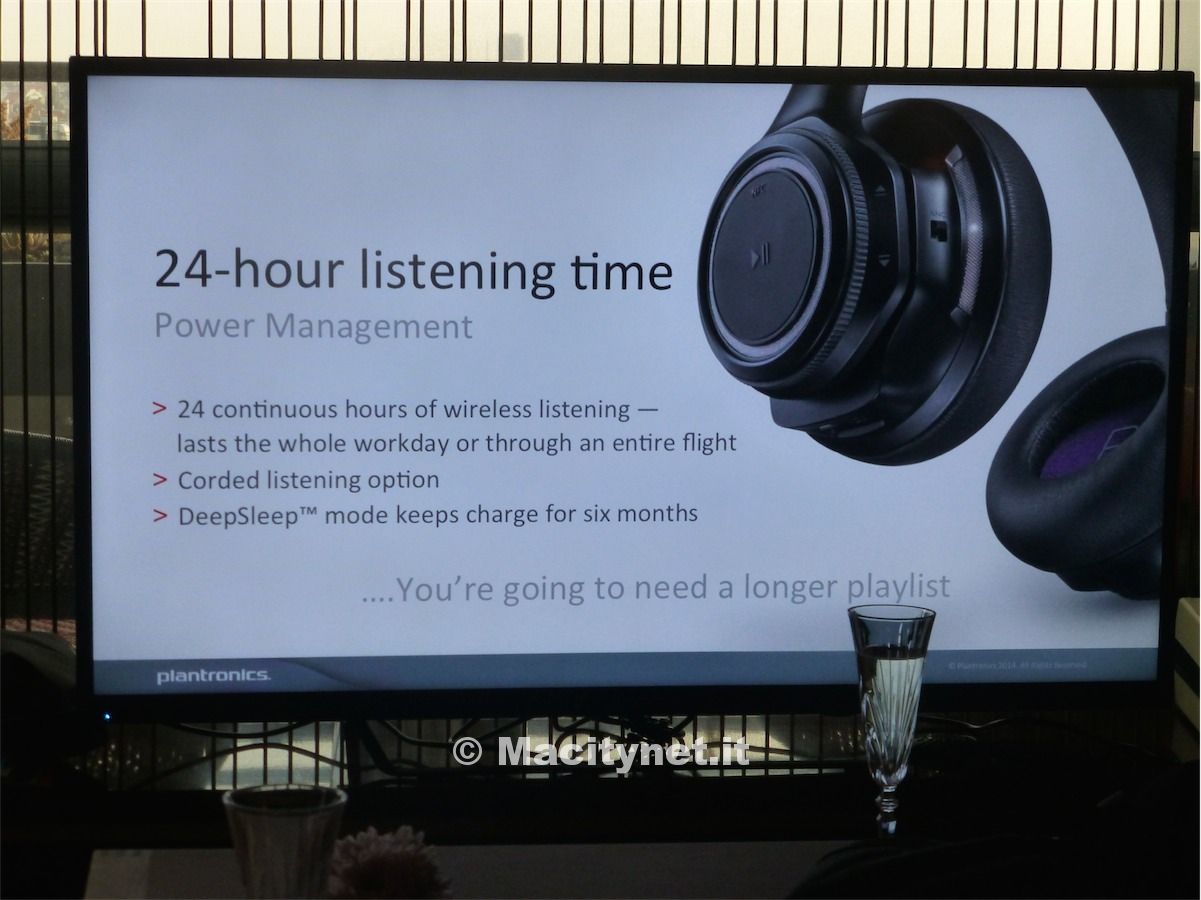 Non a caso il marketing Plantronics ha terminato la presentazione delle cuffie BackBeat Pro con un claim particolarmente indovinato che sottolinea la notevole autonomia di 24 ore via Bluetooth: Avrai bisogno di una playlist più lunga.