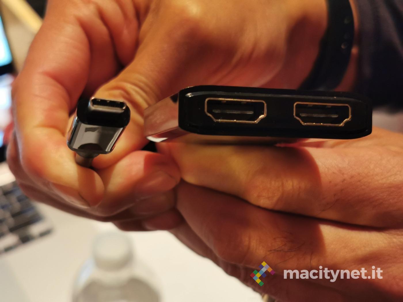 Il nuovo accessorio Plugable TBT3-UDZ offre questa possibilità grazie al chipset Intel Titan Ridge; è ad ogni modo necessario sfruttare un Mac con di Thunderbolt 3: alcune funzioni saranno limitate quando usate su Mac o iPad Pro con porta USB-C non Thunderbolt 3.