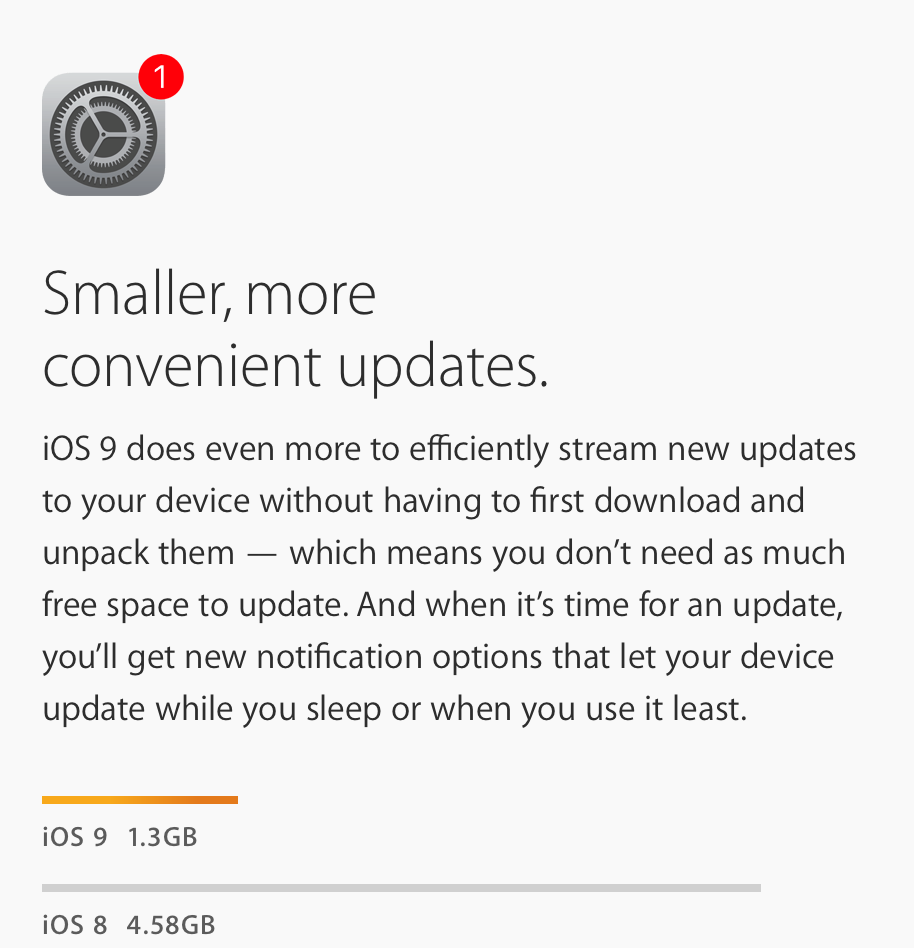 Come nota Macrumors questa è solo una delle tattiche assunte da Apple per aiutare chi ha dispositivi con una ridotta capacità ad installare in maniera efficiente gli aggiornamenti del sistema operativo. iOS 9, ad esempio, ha ora una dimensione di solo 1,3 GB contro i 4,58 GB di iOS 8. In più alcuni aggiornamenti vengono mandati in streaming, questo vuol dire che fluiscono progressivamente e si installano direttamente dal server al dispositivo senza essere prima scaricati.