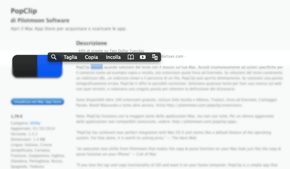 PopClip è disponibile in versione free trial sul sito ufficiale, mentre l’acquisto della versione completa si effettua su Mac App Store a questo indirizzo al prezzo di 1,79 euro.
