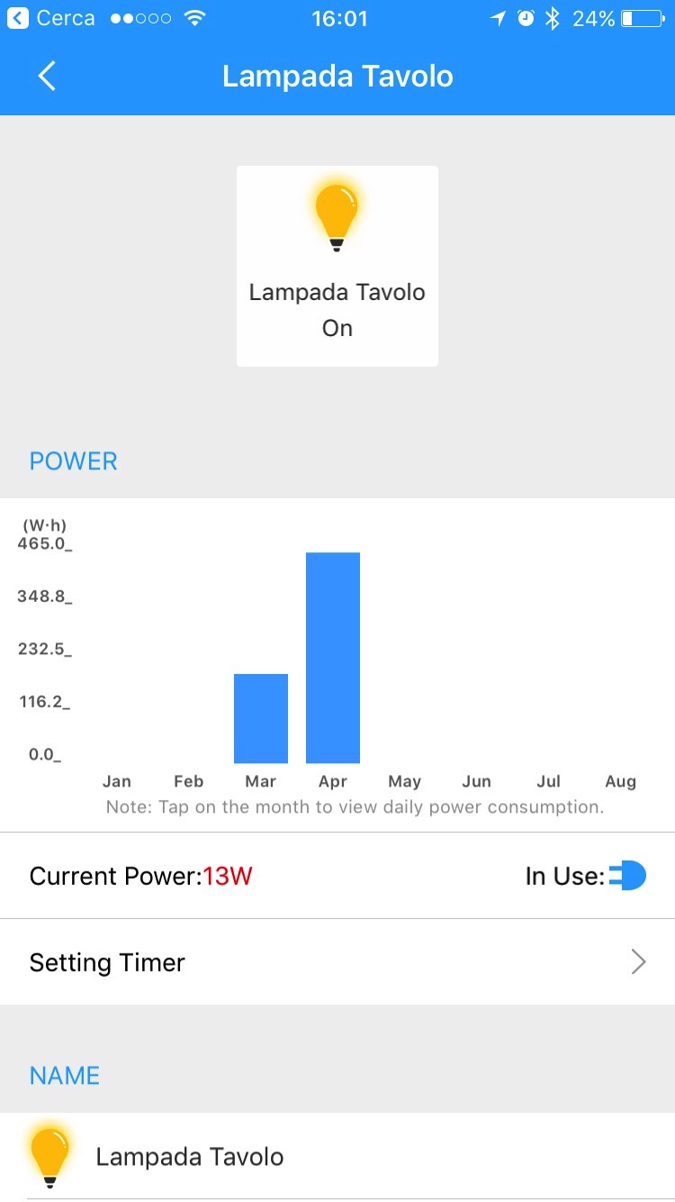 Come vedete dalle schermate della nostra galleria il portalampade ha inoltre la possibilità di gestire un controllo dei consumi della lampada collegata: questo è comodo sia per valutare complessivamente l’assorbimento del bulbo e con un software che somma le statistiche, quale è l’andamento generale nella casa.