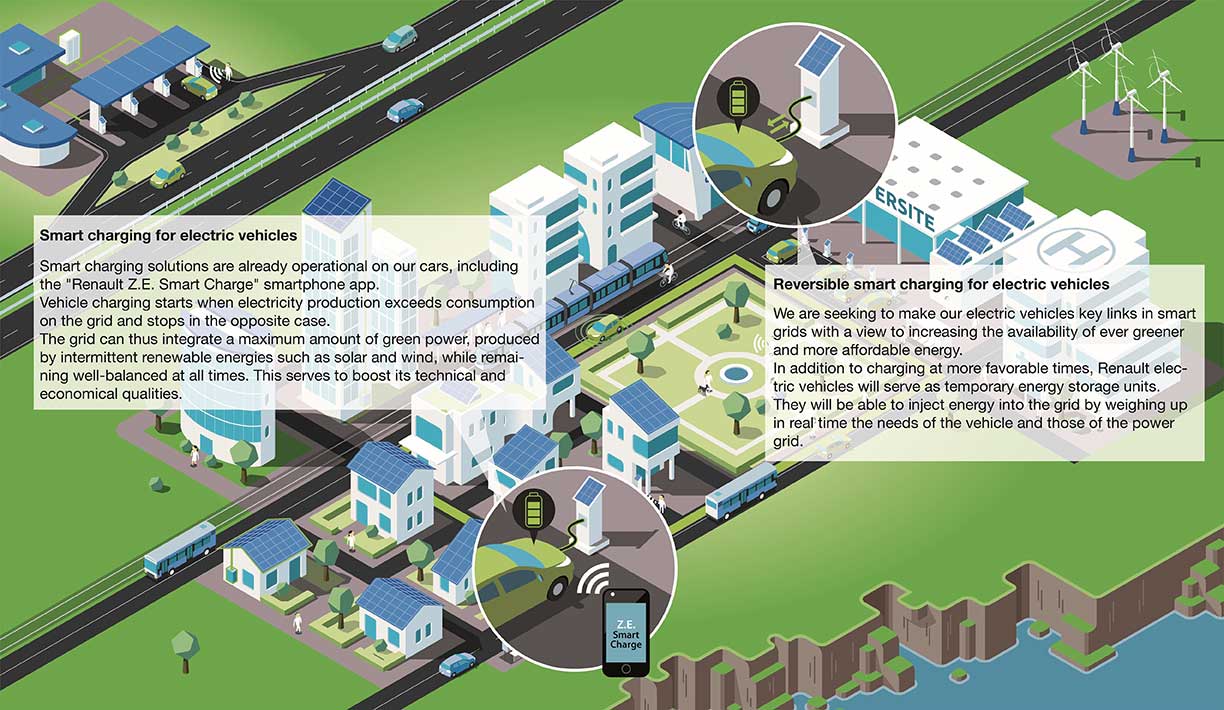La ricarica intelligente, o smart charging, modula la ricarica del veicolo in funzione delle esigenze dell’utente e dell’offerta di elettricità disponibile sulla rete. La ricarica è più intensa quando l’offerta di elettricità è più abbondante del fabbisogno, in particolare nei momenti dei picchi di produzione delle energie rinnovabili. La ricarica si interrompe quando, nella rete, la domanda di elettricità è superiore all’offerta. La rete elettrica ottimizza così la fornitura di energia rinnovabile locale.