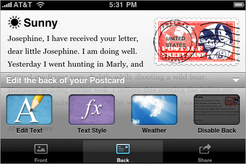 Spedire cartoline ad amici e partenti è un piacere, lo è meno la fase di acquisto in negozio, la caccia al francobollo e le eventuali file che dobbiamo sopportare nel processo. Con iPhone possiamo dire addio alle storiche cartoline per approdare all’era digitale utilizzando il programma Postman. Per creare una cartolina è sufficiente scattare una fotografia al volo oppure sceglierne una dal nostro archivio. A questo punto basta inserire il saluto desiderato nella parte frontale e poi scrivere un bel messaggio sul retro, proprio come una cartolina tradizionale. Per completare l’opera possiamo anche scegliere una cornice o un tema grafico tra quelli già pronti per l’utilizzo forniti dal software, infine inviare.