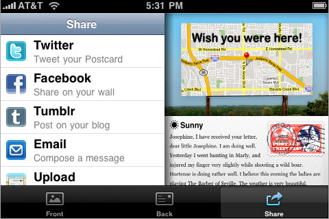 Con Postman possiamo spedire cartoline digitali non solo direttamente sul Web e come allegati email, ma anche indirizzarle a Facebook, Twitter e Tumblr in pratica tutti i principali e più utilizzati siti di social network. Considerando l’approssimarsi delle ferie e la praticità delle funzioni offerte, Postman è un acquisto a cui è difficile resistere soprattutto per gli utenti di iPhone. Disponibile su App Store a soli 79 centesimi.