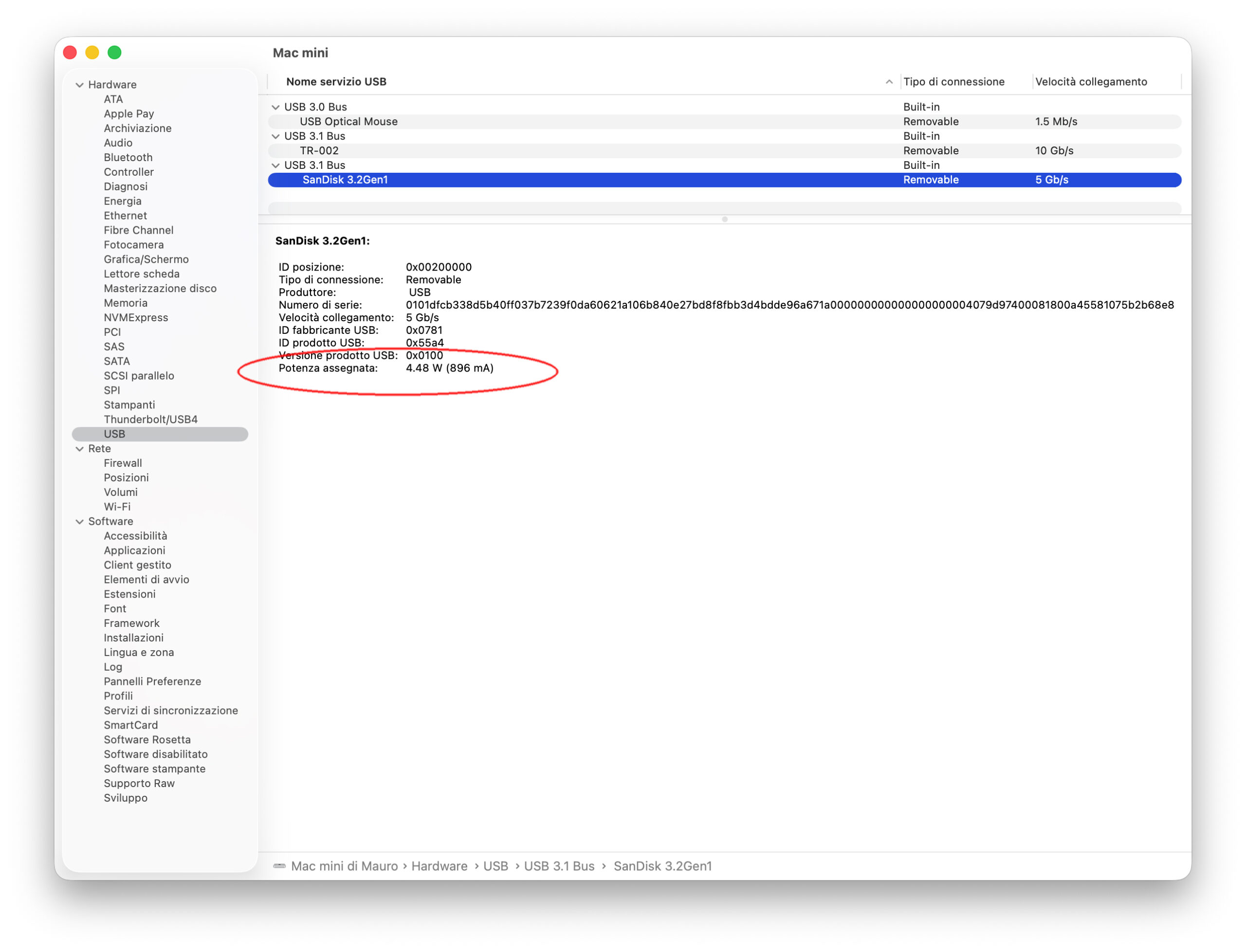 - Nella colonna a sinistra di “Resoconto di sistema” selezionate “USB”: verranno mostrati dettagli sulle periferiche USB attive, cioè al momento collegate e tra le informazioni la “potenza assegnata” in W. Come accennato, con alcune periferiche questo dato non è indicato (accessori che non comunicato al sistema il valore richiesto) e si suppone che il controller assegni il massimo.