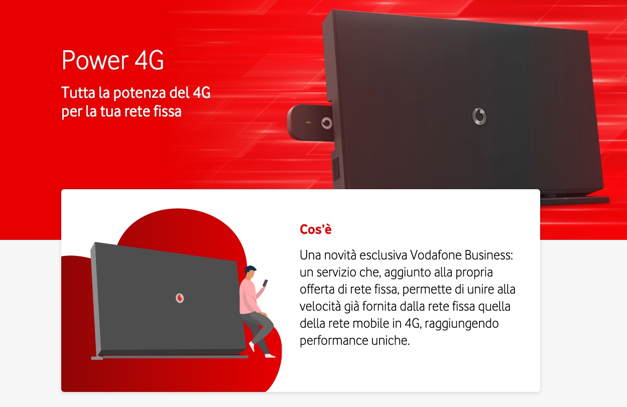 Imprenditori, professionisti e aziende, hanno la necessità di avere sempre a disposizione una connessione veloce e stabile, al fine di svolgere al meglio il proprio lavoro. Grazie al servizio Power 4G Vodafone di Vodafone Business, le aziende possono aumentare la velocità della connessione su linea fissa: si tratta infatti dell’unico servizio disponibile oggi sul mercato che permette di abbinare la connettività della rete mobile in 4G di Vodafone alla rete fissa.