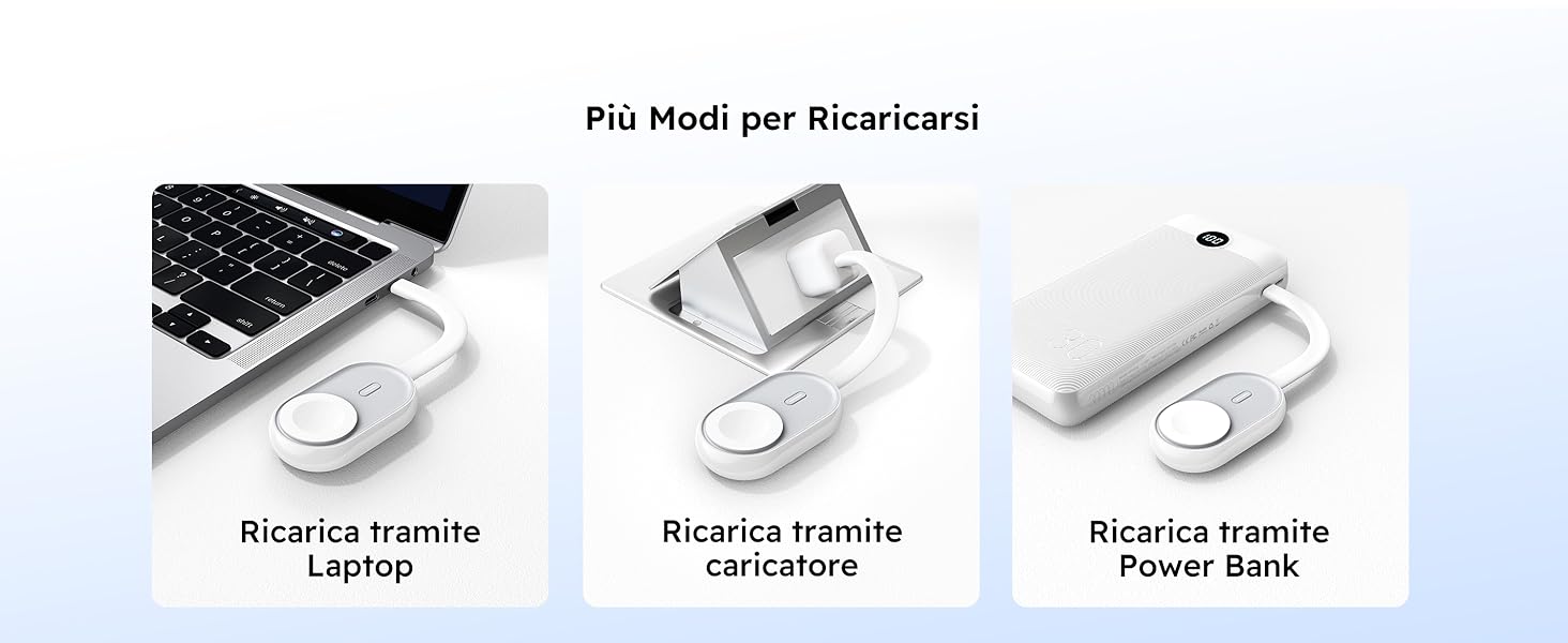 Questo accessorio è un piccolo elemento in plastica di forma ovale che integra sia una batteria che un cavo di ricarica. C’è anche la classica pastiglia magnetica che si applica saldamente al dorso di Apple Watch e grazie alla quale trasmette energia al dispositivo Apple.