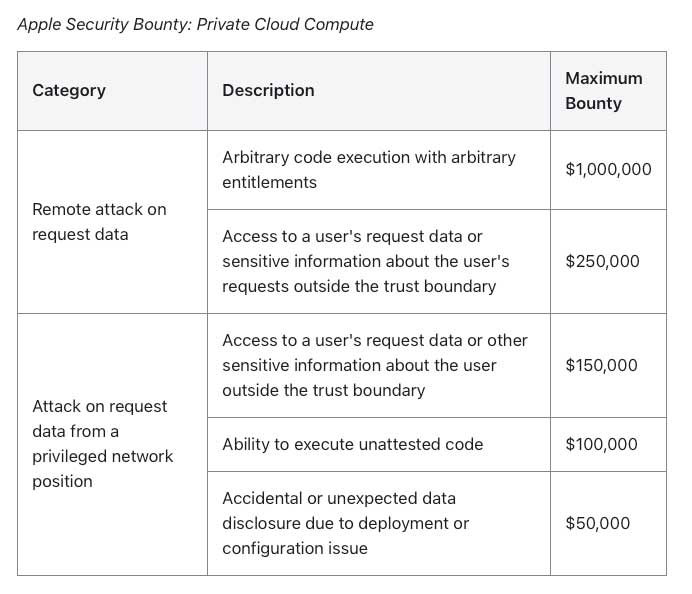 Le ricompense, come abbiamo riferito qui, sono pensate per chi dimostra la presenza di vulnerabilità nel Private Cloud Compute, i server che Apple invita a “scardinare” e attaccare per dimostrare la sicurezza e la possibilità di pregiudicare i dati.