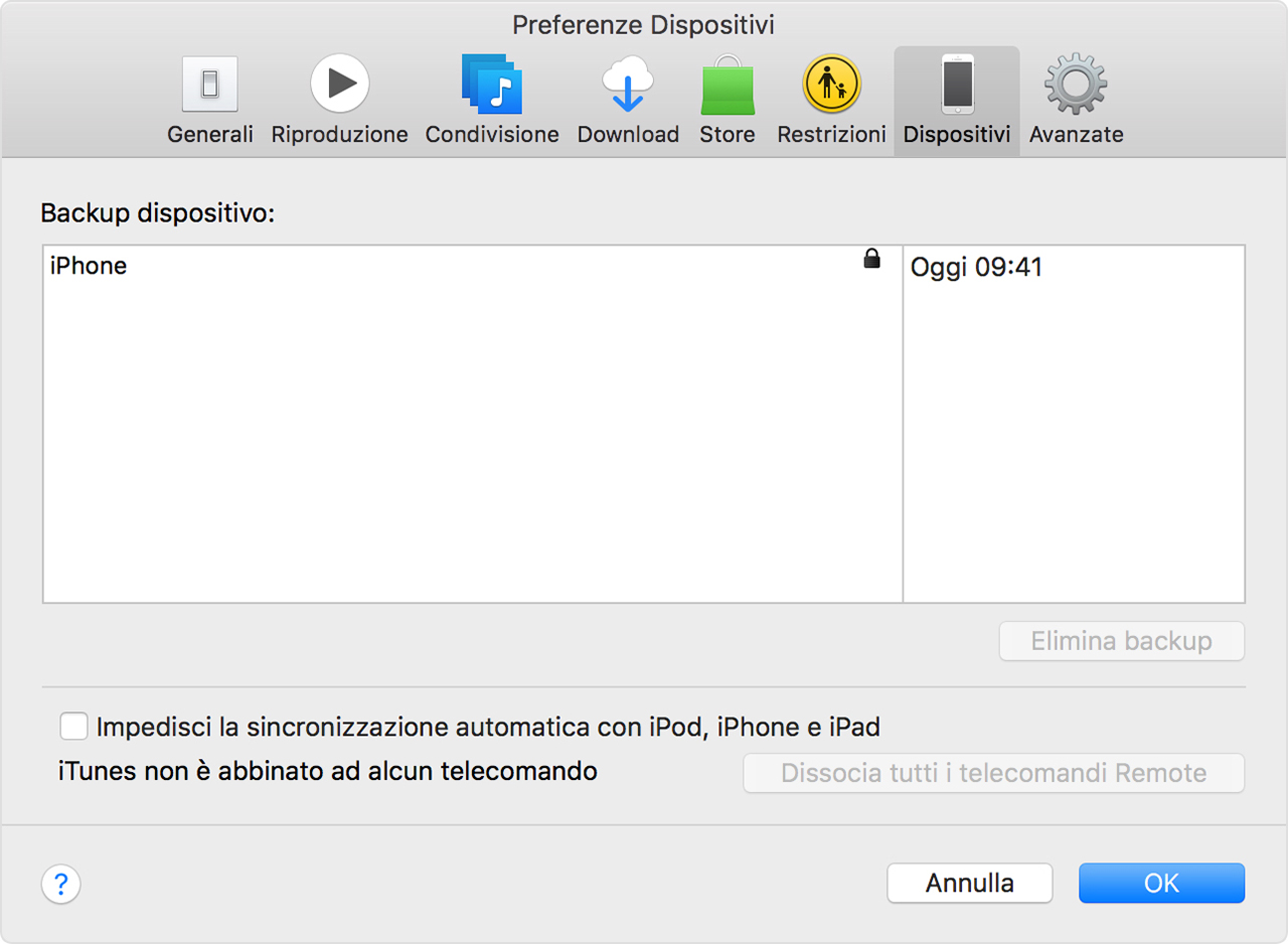 - Al termine della procedura, è possibile verificare che il backup sia stato completato correttamente aprendo iTunes, selezionando dal menu “iTunes” la voce “Preferenze” e andando nella sezione “Dispositivi” (se usate iTunes su Windows scegliete Modifica > Dispositivi dalla barra dei menu nella parte superiore della finestra di iTunes.) Nella finestra che compare dovreste visualizzare il nome del dispositivo con la data e l’ora in cui iTunes ha creato il backup. Se è stata scelta l’opzione “codifica del backup” dovreste visualizzare l’icona di un lucchetto accanto al nome del dispositivo.