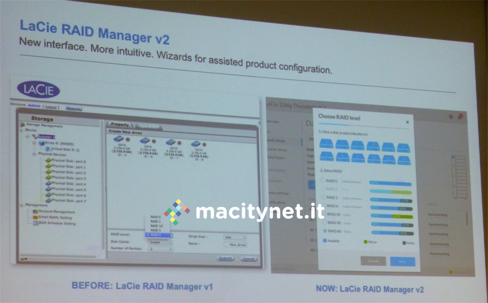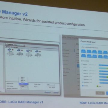 Entrambi i dispositivi possono essere configurati per lavorare in modalità RAID 0, 1, 5, 6, 10 e 50 (oltre che RAID 60 per LaCie 12big) a seconda delle esigenze di prestazioni e ridondanza dei dati, o entrambi, richiesti dall’utente. A Milano Colman Murphy, Presales Training & Support di LaCie, ha mostrato i nuovi dispositivi collegati a un PC Windows perché non era disponibile per tempo uno dei nuovi MacBook Pro, in ogni caso funzionamento e prestazioni risultano identici su entrambe le piattaforme.