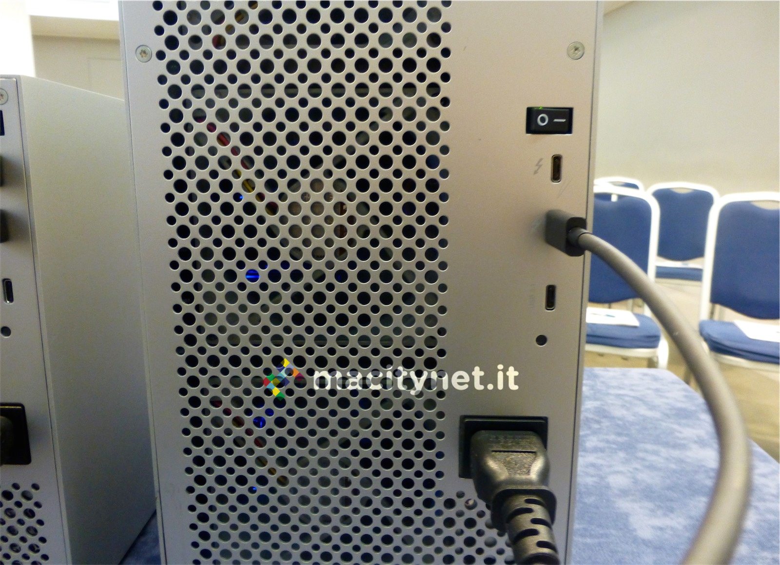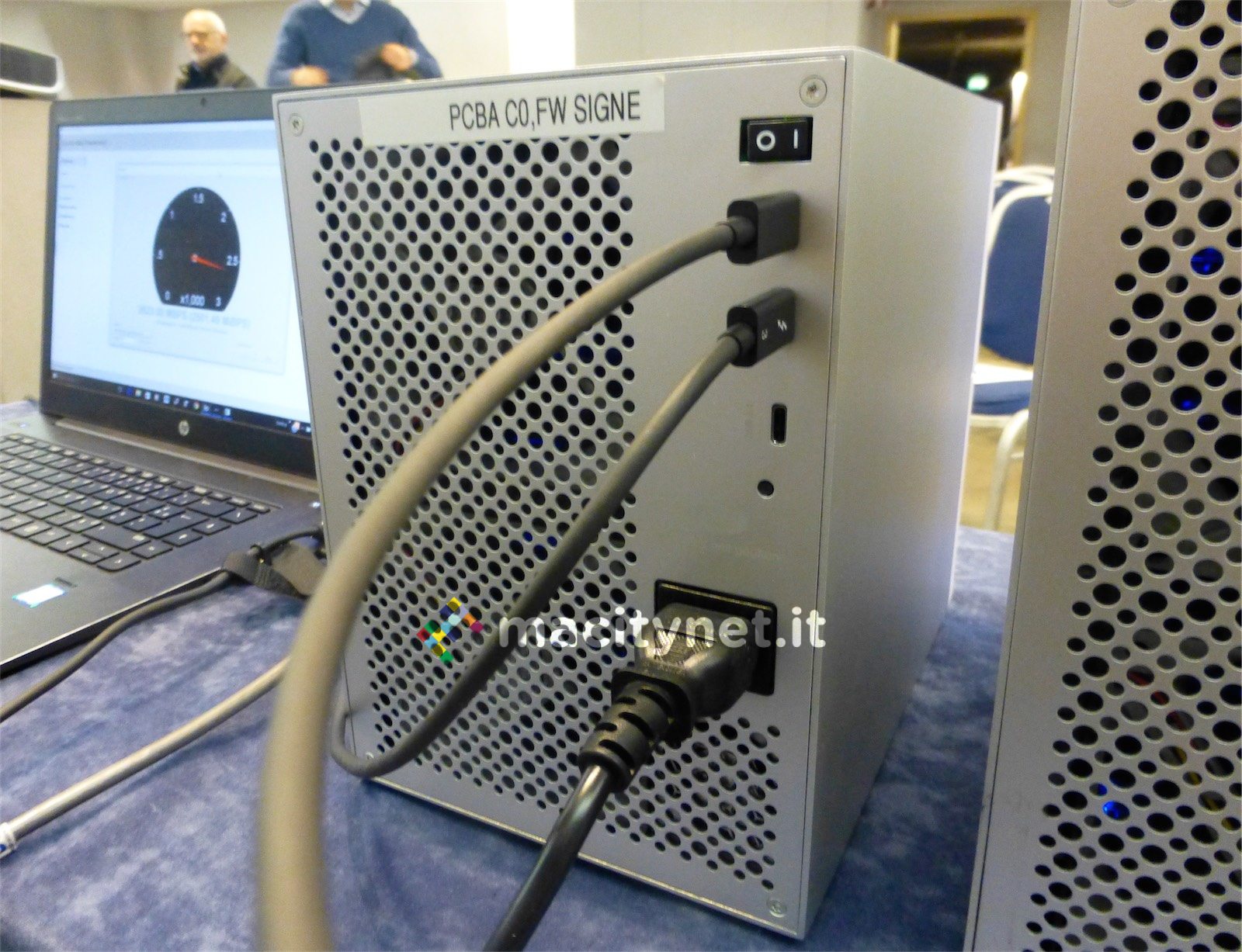 La versione mostrata in funzione su PC è identica a quella per Mac: LaCie rilascerà un aggiornamento firmware che ottimizzerà il funzionamento con i nuovi MacBook Pro in tempo per la commercializzazione dei dispositivi. Il costruttore presenta LaCie 12big e LaCie 6big come le unità di storage desktop più capienti e anche come le prime unità RAID 5 Thunderbolt 3 compatibili anche con USB. Nella confezione oltre a un cavo Thunderbolt 3 per le prestazioni massime, è incluso un cavo USB-C 3.1 e anche un cavo adattatore da USB-C a USB-A per poter collegare le unità praticamente con qualsiasi computer in commercio, ovviamente con le prestazioni sensibilmente inferiori della tecnologia USB.