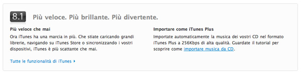 In un riquadro intitolato “Più veloce. Più Brillante. Più divertente” Cupertino spiega che la nuova versione sarà più veloce nell’apertura delle librerie musicali, nell’accesso al negozio iTunes online e infine anche per la sincronizzazione dei dispositivi.