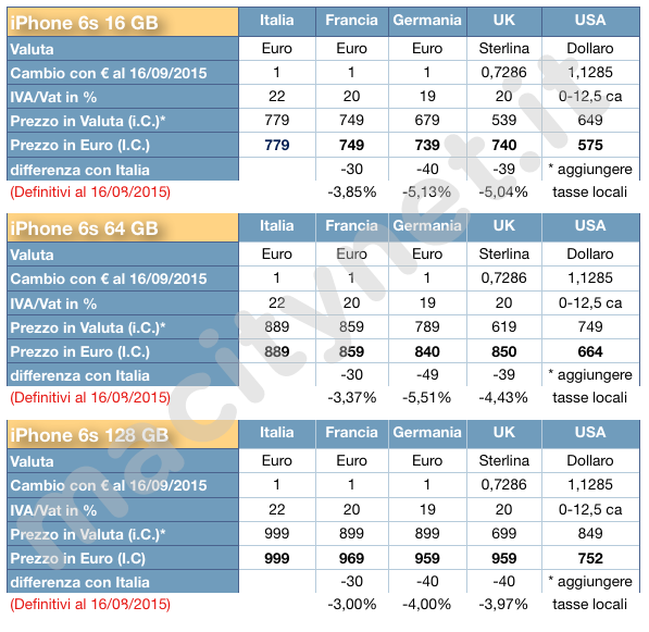 Le differenze di prezzo per iPhone 6s tra Italia e altri paesi europei ancora ci sono, ma non sono così evidenti come in passato. Per alcuni modelli sono sotto il 3% rispetto ai principali paesi, nei casi peggiori del 5%. Se si tolgono le tasse locali (che non sono decise da Apple), la differenza scende tra l’1,5% e arriva a poco più del 2%. È questo quel che emerge da un confronto che abbiamo rapidamente messo in atto questa sera, dopo avere appreso, anche se in via ufficiosa, i prezzi di iPhone 6s in Italia.