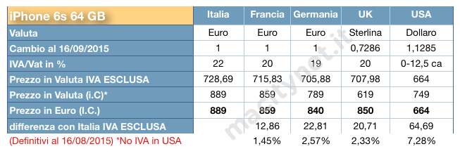 Abbiamo fatto un esperimento, eliminando solo l’Imposta sul Valore Aggiunto dai prezzi di iPhone 6s da 64 GB e il risultato è nella tabella che vedete in calce: la differenza di prezzo si colloca ad appena l’1,45% se si parla di un acquisto in Francia e del 2,57% in Germania (dove però, come detto, non c’è la tassa sull’equo compenso).