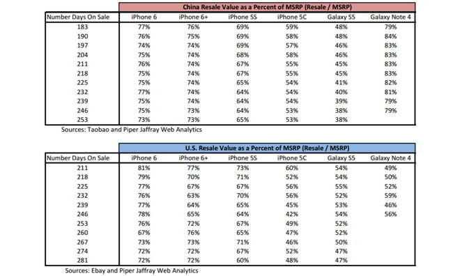 PiperJaffray ha tracciato aste su eBay e Taobao i prezzi degli iPhone ma anche di vari dispositivi Samsung Galaxy partendo dal 2013. Per determinare un modello di valore equo, la società ha contato gli ultimi 50 telefoni venduti ogni settimana, creato un indice dei prezzi e confrontando il prezzo di vendita medio rispetto al prezzo di vendita dei dispositivi equivalenti venduti al dettaglio.