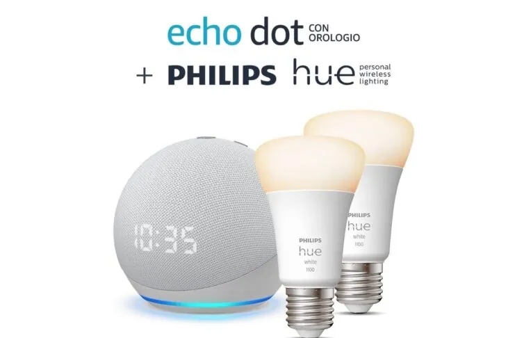 - Echo Dot con orologio (4ª Gen) + 2 Lampadine Philips Hue White 34,99€ (invece di 104,98€)