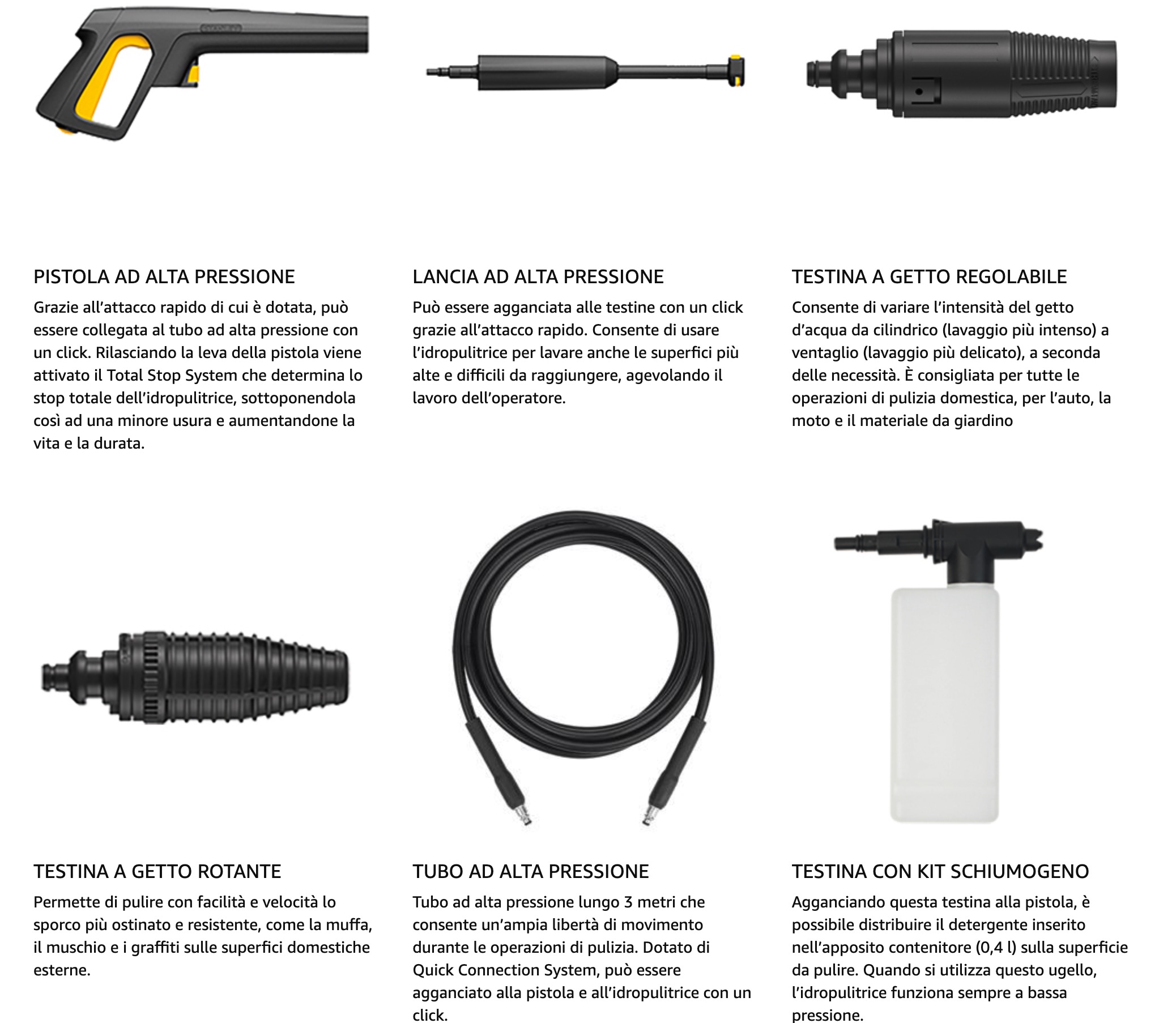 Nella confezione sono inclusi una pistola con lancia, un tubo ad alta pressione da 3 metri, una testina a getto rotante per lo sporco ostinato, una testina a getto regolabile e un kit schiumogeno da 0,4 litri. Il filtro integrato sull’ingresso dell’acqua è ispezionabile e protegge l’idropulitrice da impurità o detriti provenienti dalla rete idrica.